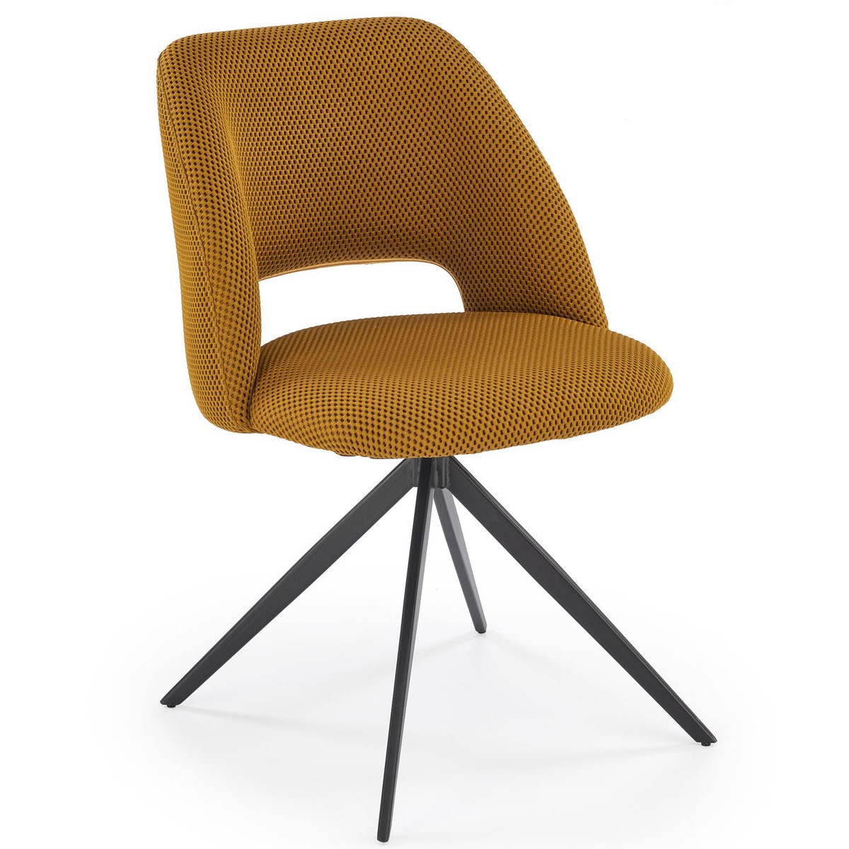 Nowoczesne krzesło, które doskonale łączy styl z funkcjonalnością, stanowiąc elegancki dodatek do każdego nowoczesnego wnętrza. Jego solidny stelaż wykonany z metalu w głębokim, matowym czarnym kolorze nie tylko zapewnia stabilność, ale także nadaje krzesłu wyrazistego charakteru. Siedzisko i oparcie krzesła zostały starannie obite musztardową tkaniną membranową, co nie tylko nadaje mu lekkości, ale także zapewnia wyjątkowy komfort użytkowania. Tkanina membranowa jest przyjemna w dotyku, elastyczna i przewiewna, co sprawia, że krzesło jest doskonałym wyborem na długotrwałe siedzenie. Musztardowy kolor tkaniny dodaje meblowi subtelnego, neutralnego charakteru, co pozwala na łatwe dopasowanie do różnych aranżacji wnętrz. Innowacyjną funkcją tego krzesła jest jego zdolność do obracania, co sprawia, że jest wszechstronne i dostosowane do różnych przestrzeni, takich jak biuro, gabinet czy salon.