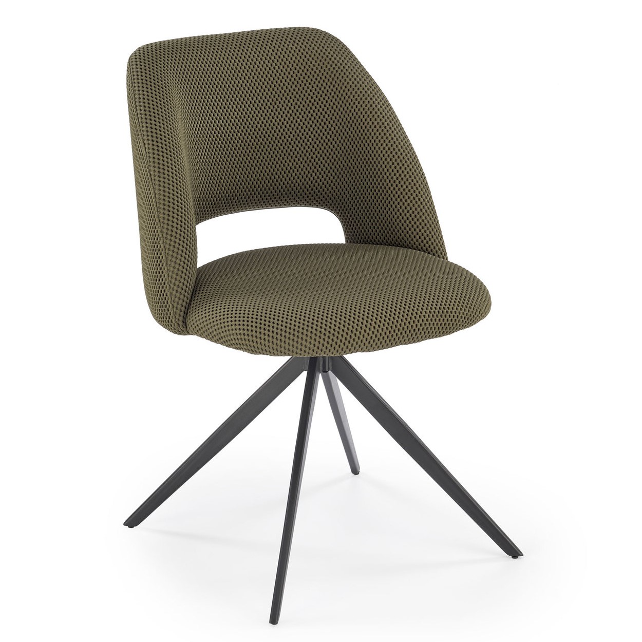Nowoczesne krzesło, które doskonale łączy styl z funkcjonalnością, stanowiąc elegancki dodatek do każdego nowoczesnego wnętrza. Jego solidny stelaż wykonany z metalu w głębokim, matowym czarnym kolorze nie tylko zapewnia stabilność, ale także nadaje krzesłu wyrazistego charakteru. Siedzisko i oparcie krzesła zostały starannie obite oliwkową tkaniną membranową, co nie tylko nadaje mu lekkości, ale także zapewnia wyjątkowy komfort użytkowania. Tkanina membranowa jest przyjemna w dotyku, elastyczna i przewiewna, co sprawia, że krzesło jest doskonałym wyborem na długotrwałe siedzenie. Oliwkowy kolor tkaniny dodaje meblowi subtelnego, neutralnego charakteru, co pozwala na łatwe dopasowanie do różnych aranżacji wnętrz. Innowacyjną funkcją tego krzesła jest jego zdolność do obracania, co sprawia, że jest wszechstronne i dostosowane do różnych przestrzeni, takich jak biuro, gabinet czy salon.