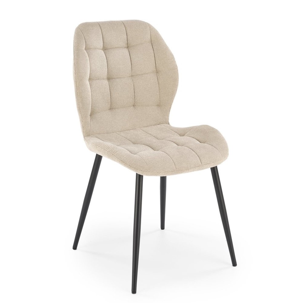 Krzesło o eleganckim designie, charakteryzujące się czarną konstrukcją wykonaną ze stali, emanuje nowoczesnością i stylowym wykończeniem. Solidna stalowa rama nadaje mu trwałość i stabilność, jednocześnie dodając subtelny akcent kolorystyczny. Wygodne siedzisko i oparcie są obite beżową tkaniną, co nadaje krzesłu przytulny, a zarazem nowoczesny wygląd. Tkanina jest nie tylko estetyczna, ale również łatwa do utrzymania w czystości, co sprawia, że krzesło jest praktyczne w użytkowaniu. Krzesło idealnie komponuje się z różnymi stylami wnętrz, od nowoczesnych po klasyczne, dzięki minimalistycznemu designowi i uniwersalnej kolorystyce. Jest doskonałym uzupełnieniem stołu do jadalni, tworząc przy tym harmonijną i elegancką przestrzeń.