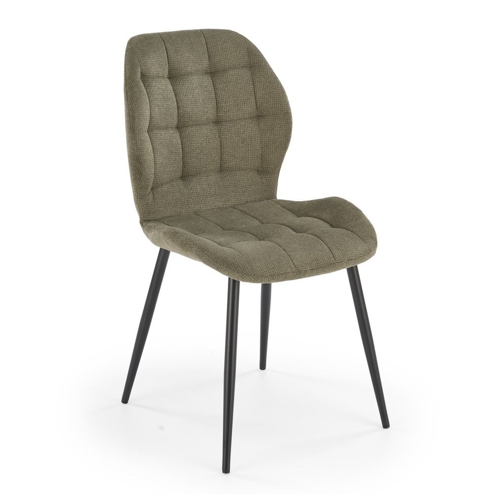 Krzesło o eleganckim designie, charakteryzujące się czarną konstrukcją wykonaną ze stali, emanuje nowoczesnością i stylowym wykończeniem. Solidna stalowa rama nadaje mu trwałość i stabilność, jednocześnie dodając subtelny akcent kolorystyczny. Wygodne siedzisko i oparcie są obite oliwkową tkaniną, co nadaje krzesłu przytulny, a zarazem nowoczesny wygląd. Tkanina jest nie tylko estetyczna, ale również łatwa do utrzymania w czystości, co sprawia, że krzesło jest praktyczne w użytkowaniu. Krzesło idealnie komponuje się z różnymi stylami wnętrz, od nowoczesnych po klasyczne, dzięki minimalistycznemu designowi i uniwersalnej kolorystyce. Jest doskonałym uzupełnieniem stołu do jadalni, tworząc przy tym harmonijną i elegancką przestrzeń.