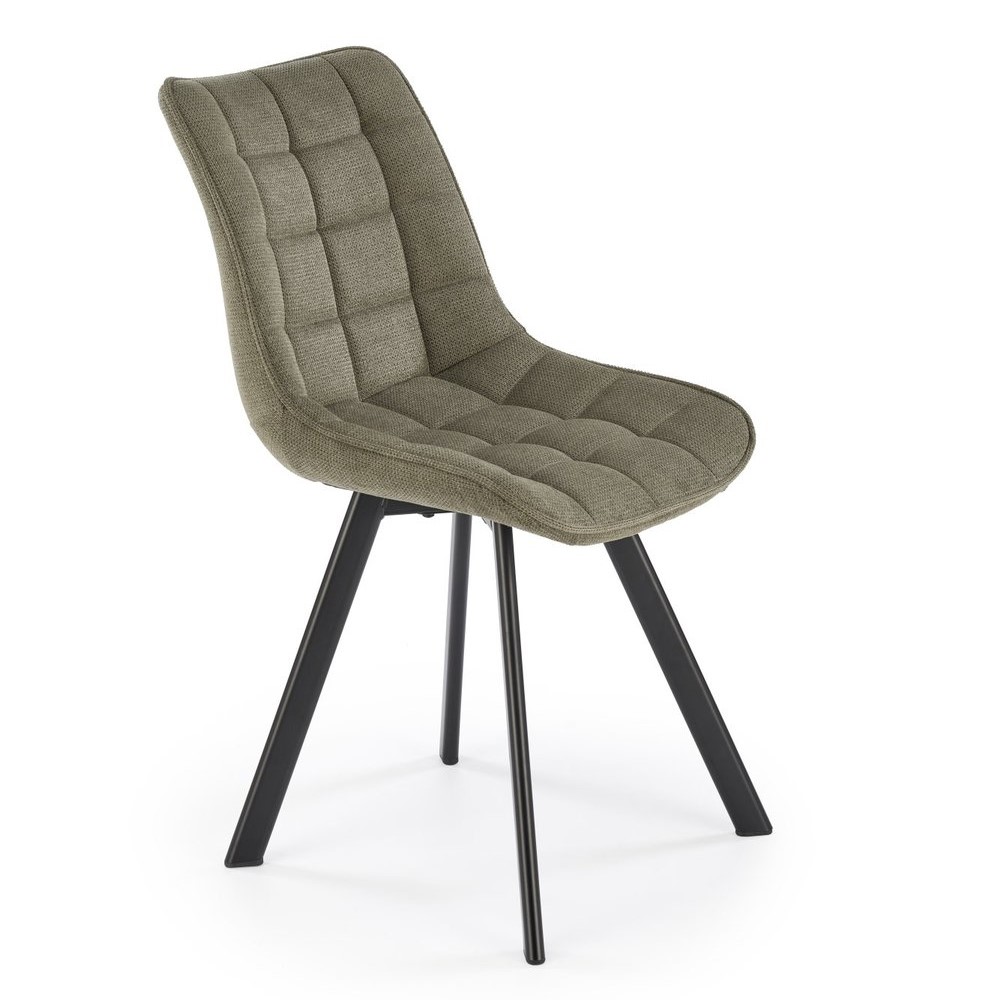Krzesło wyróżnia się elegancją i nowoczesnym designem, idealnym do stylowych wnętrz. Jego solidna konstrukcja została wykonana z czarnej stali, co nadaje mu nie tylko wytrzymałość, ale także minimalistyczny, nowoczesny charakter. Siedzisko i oparcie pokryte są wysokiej jakości oliwkową tkaniną, co nie tylko podkreśla elegancję krzesła, ale także zapewnia wygodę użytkowania.. Prosta forma krzesła sprawia, że doskonale komponuje się z nowoczesnymi wnętrzami, tworząc harmonijną całość.