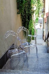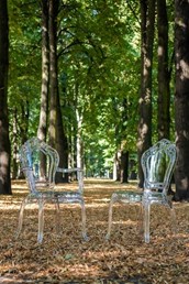 Dzięki zastosowaniu przezroczystego materiału, krzesło optycznie nie zabiera miejsca.