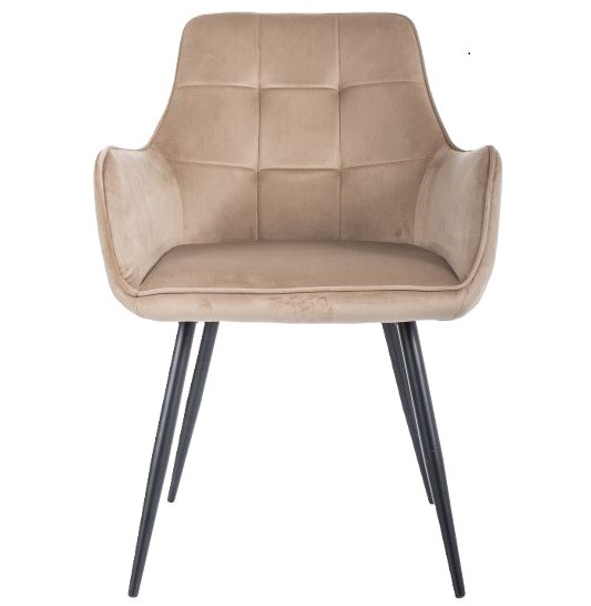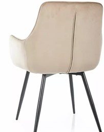 Konstrukcja krzesła opiera się na metalowej podstawie w matowym czarnym wykończeniu, co stanowi doskonały kontrast dla beżowego aksamitu i nadaje meblowi wyrafinowany wygląd. Dodatkowo, dekoracyjne przeszycia na oparciu podkreślają dbałość o detale i dodają krzesłu subtelnej elegancji.