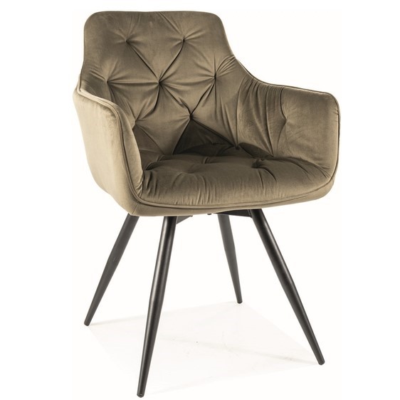 Materiał obicia tego krzesła to luksusowa tkanina aksamit Bluvel, w odcieniu oliwkowego (77). Aksamitna tekstura nadaje mu niepowtarzalnego charakteru, tworząc jednocześnie subtelny i elegancki wygląd. Kolor ciemnego beżu jest uniwersalny, co sprawia, że krzesło doskonale współgra z różnymi aranżacjami wnętrz.