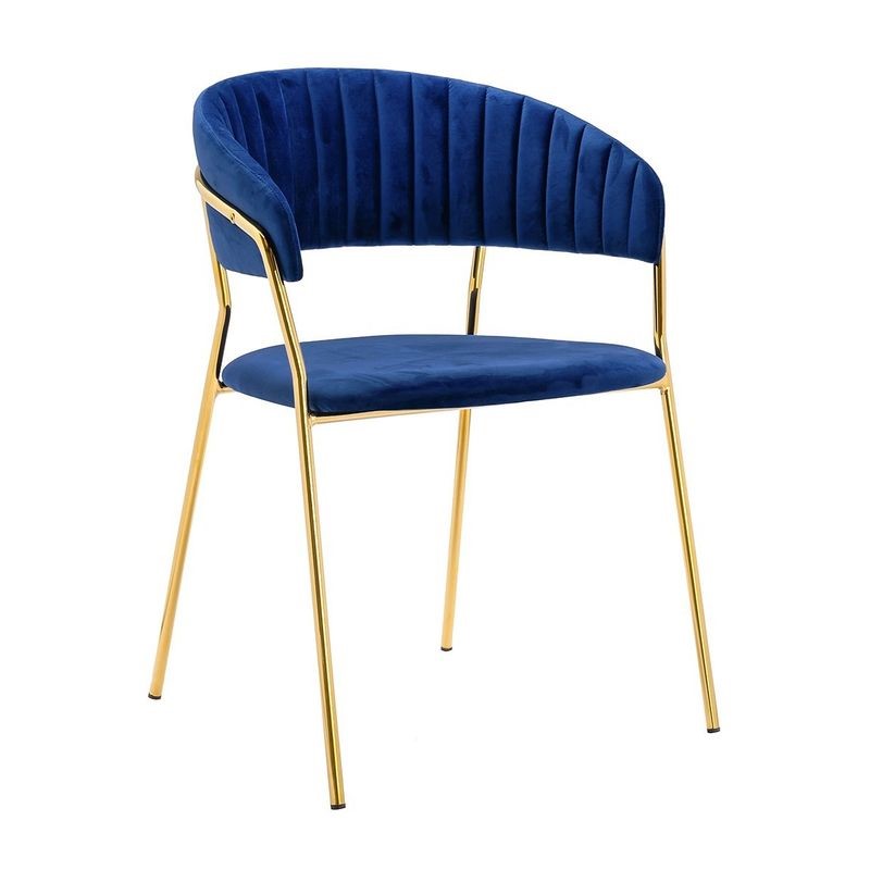 Krzesło Margo w kolorze ciemny niebieski. Siedzisko i oparcie tapicerowane miękkim i przyjemnym w dotyku welurem. Konstrukcja z metalu w kolorze złotym, błyszczącym. Margo to doskonałe połączenie modnej tkaniny ze złotem. Pionowe przeszycia na oparciu dodają elegancji. Krzesło idealnie pasujące do wnętrz nowoczesnych i klasycznych. Waga netto 1 szt.: 5,5 kg. Waga opakowania: 7 kg. Wymiary opakowania: 78,5 cm x 58,5 cm x 63 cm. Maksymalna ilość szt. w opakowaniu: 2 Sposób wysyłki: Paczka Produkt złożony: Tak