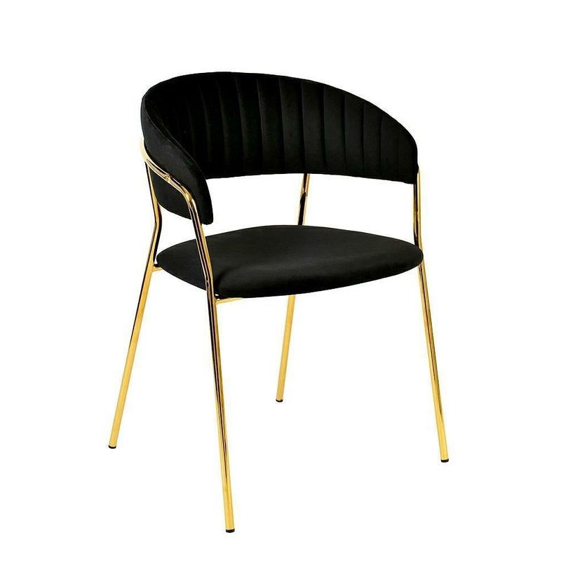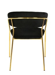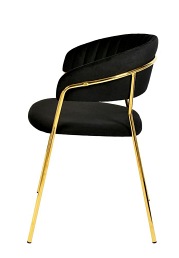 Krzesło Margo w kolorze czarnym. Siedzisko i oparcie tapicerowane miękkim i przyjemnym w dotyku welurem. Konstrukcja z metalu w kolorze złotym, błyszczącym. Margo to doskonałe połączenie modnej tkaniny ze złotem. Pionowe przeszycia na oparciu dodają elegancji. Krzesło idealnie pasujące do wnętrz nowoczesnych i klasycznych. Waga netto 1 szt.: 5,5 kg. Waga opakowania: 7 kg. Wymiary opakowania: 78,5 cm x 58,5 cm x 63 cm. Maksymalna ilość szt. w opakowaniu: 2 Sposób wysyłki: Paczka Produkt złożony: Tak