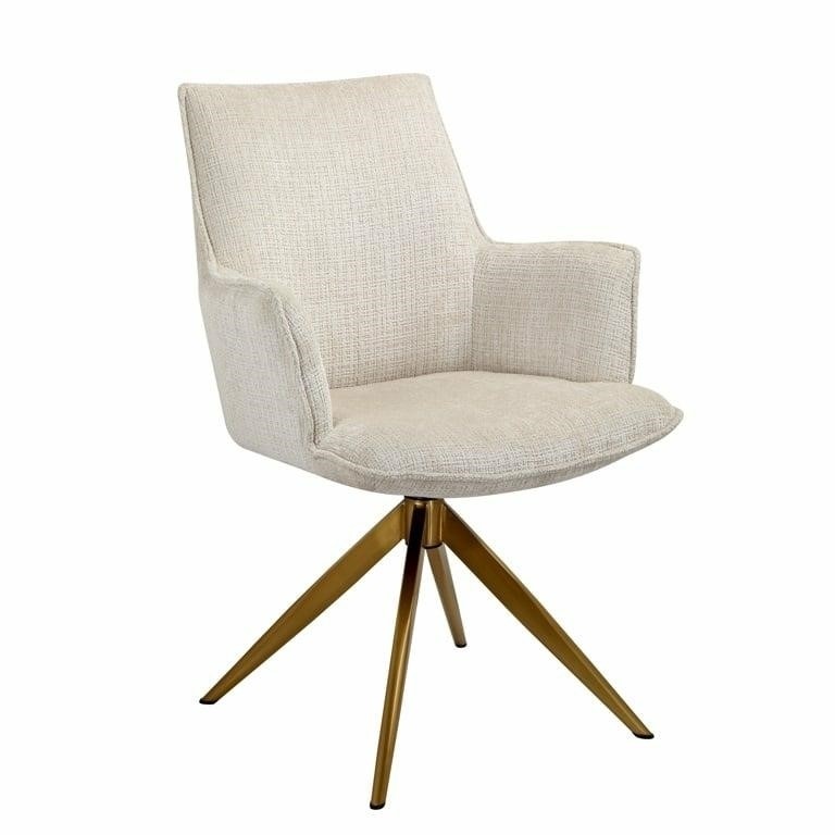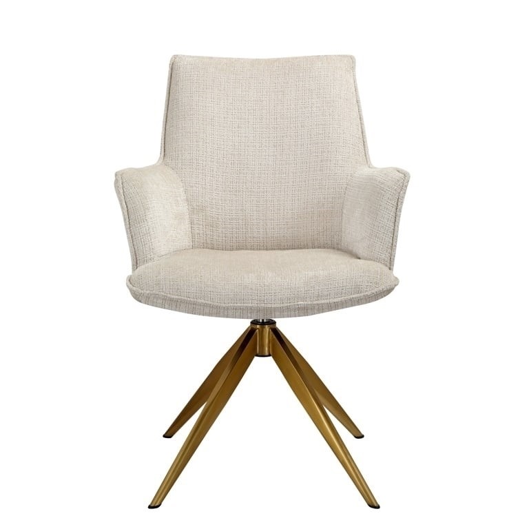 Krzesło obrotowe Dakota Arm to doskonały wybór dla osób poszukujących nowoczesnego, funkcjonalnego mebla. Jego prosty, ale elegancki design doskonale sprawdzi się w różnych wnętrzach, od biur po jadalnie. Siedzisko wykończone jasnobeżową tkaniną szenilową zapewnia komfort, a obrotowa podstawa z stali nierdzewnej w złotej kolorystyce dodaje całości wyrafinowanego charakteru. Dostępna jest również wersja bez podłokietników, co daje dodatkową elastyczność w doborze.