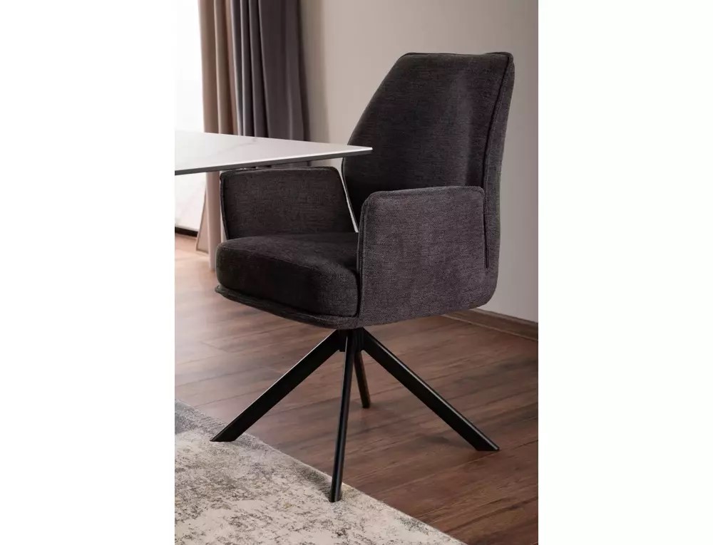Krzesło Hugo Brego łączy nowoczesny design z wyjątkową funkcjonalnością. Dzięki obrotowemu siedzisku z funkcją powrotu, idealnie sprawdzi się w dynamicznych wnętrzach. Metalowy stelaż w czarnym kolorze oraz tapicerka w ciemnym szarym odcieniu dodają elegancji i klasy, czyniąc to krzesło idealnym wyborem do biura czy nowoczesnego salonu.