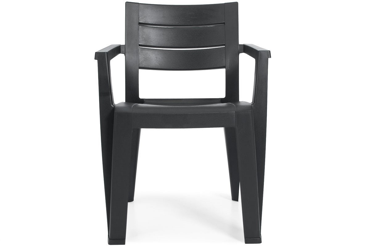 Funkcjonalne plastikowe krzesło ogrodowe JULIE z detalami imitującymi drewno, kolor grafitowy. Fotel krzesło balkonowe to idealny mebel na taras i przydomowy ogródek. Konstrukcja krzesła ogrodowego jest w całości wykonana z polipropylenu. Jest to tworzywo bardzo odporne na temperaturę, promienie UV i wodę. Fotel może być użytkowany w temperaturach od 0oC do 40oC, dzięki czemu idealnie sprawdzi się w sezonie wiosenno-letnim. Krzesła można sztaplować np. umieszczone jeden na drugim, co jest bardzo wygodne do przechowywania. Dzięki mocnej konstrukcji krzesło może być obciążone ciężarem do 110 kg, służy wyłącznie do siedzenia i nie można na nim stać. Ergonomicznie zaprojektowany kształt oparcia i głębokie siedzisko zapewniają maksymalny komfort.