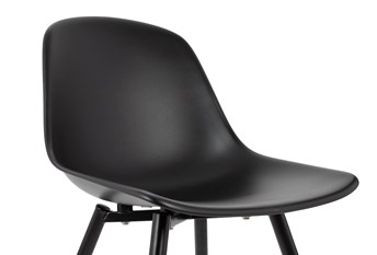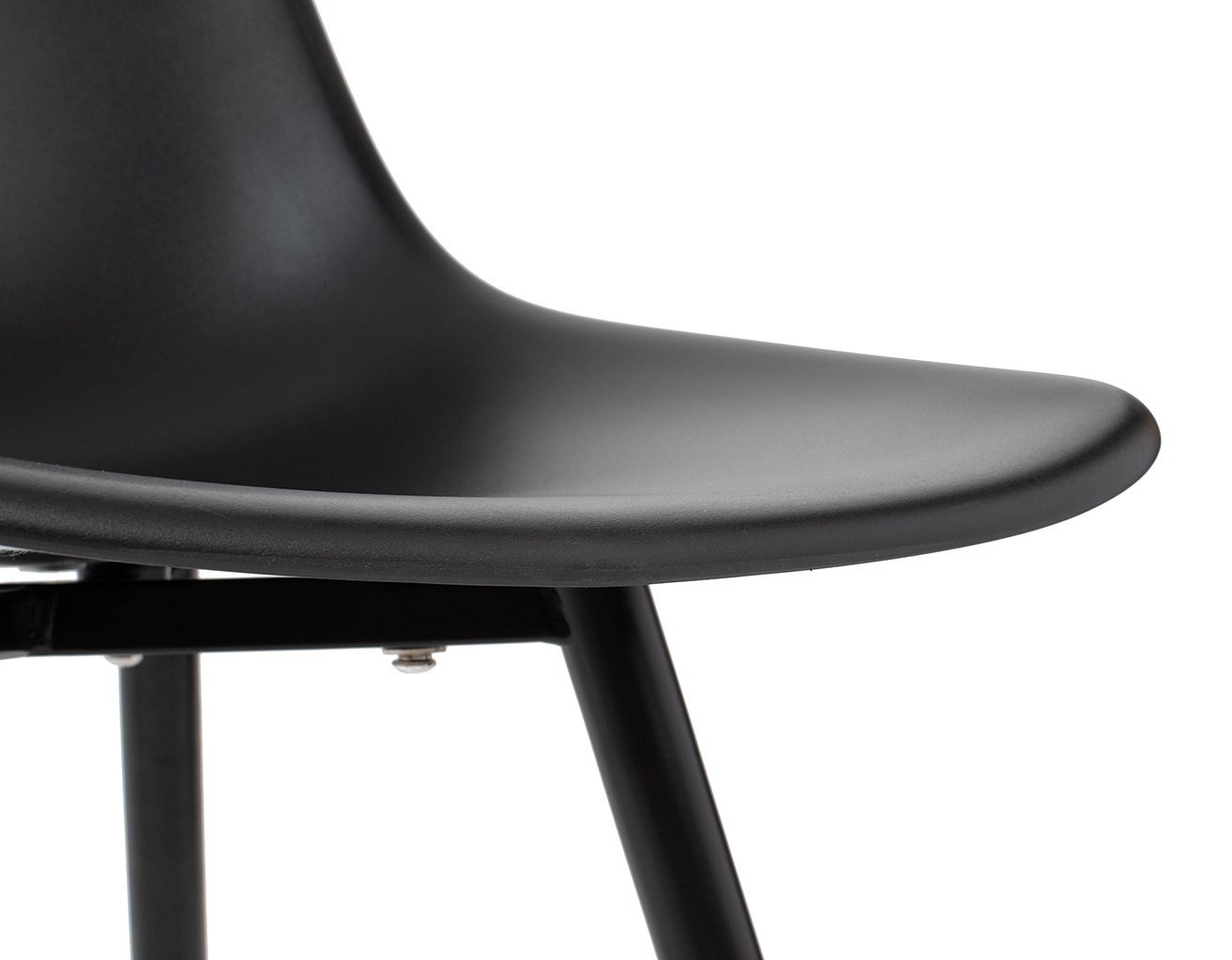 Siedzisko zostało wykonane z polipropylenu w kolorze czarnym, a podstawa z metalu lakierowanego na czarno.