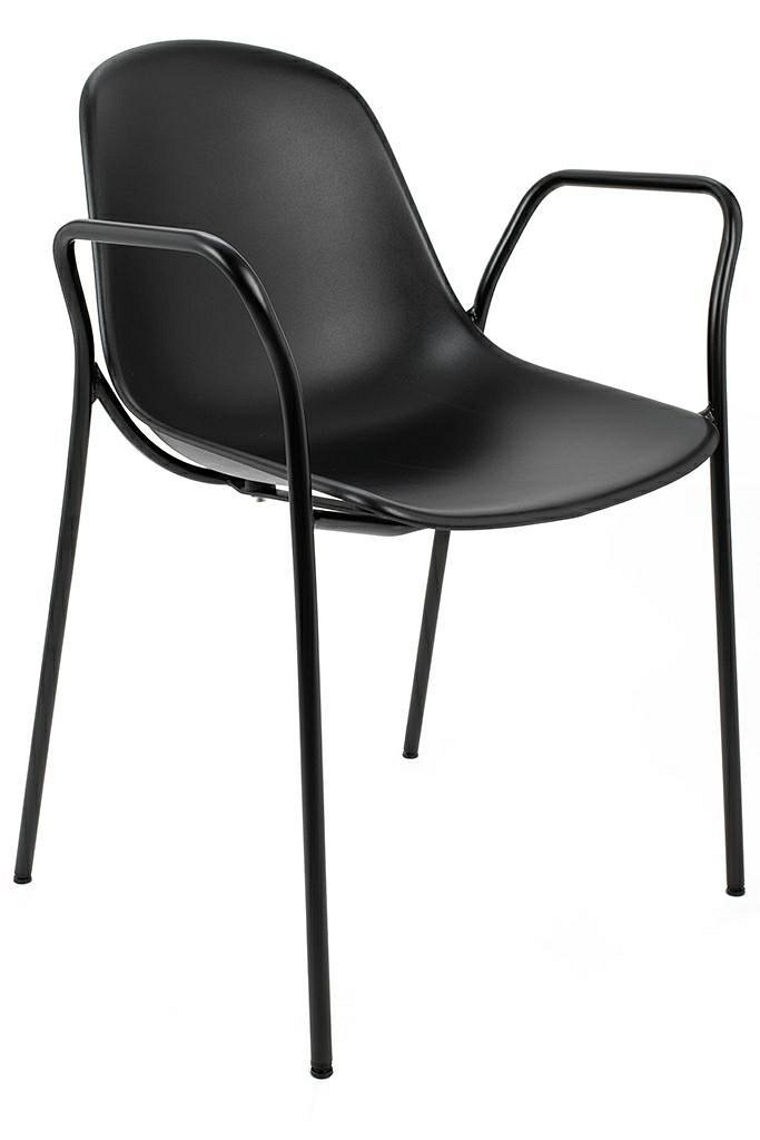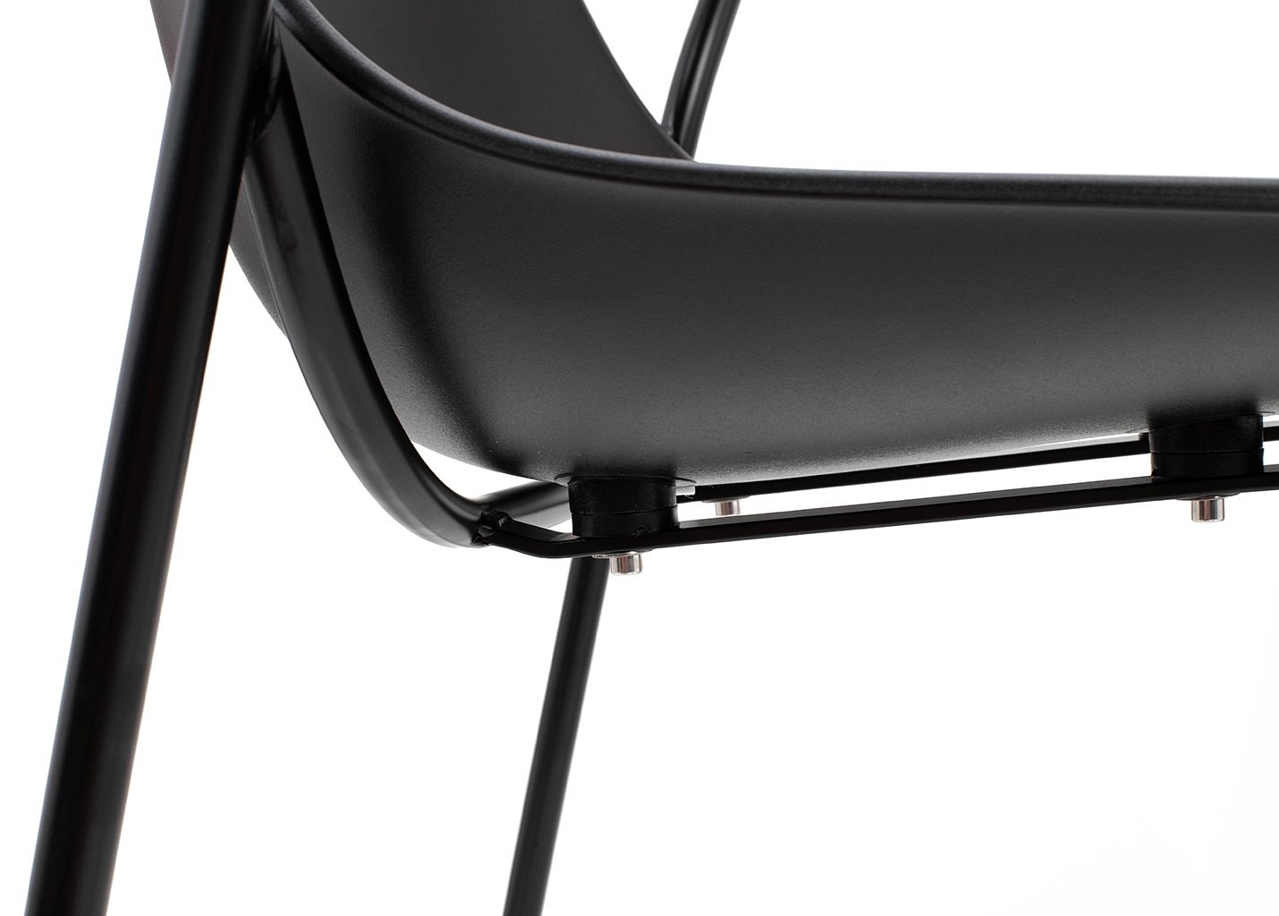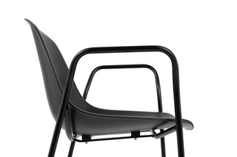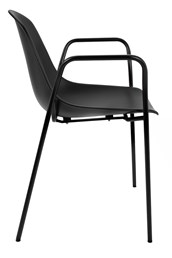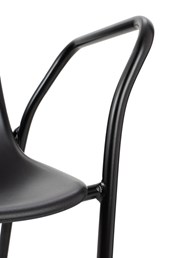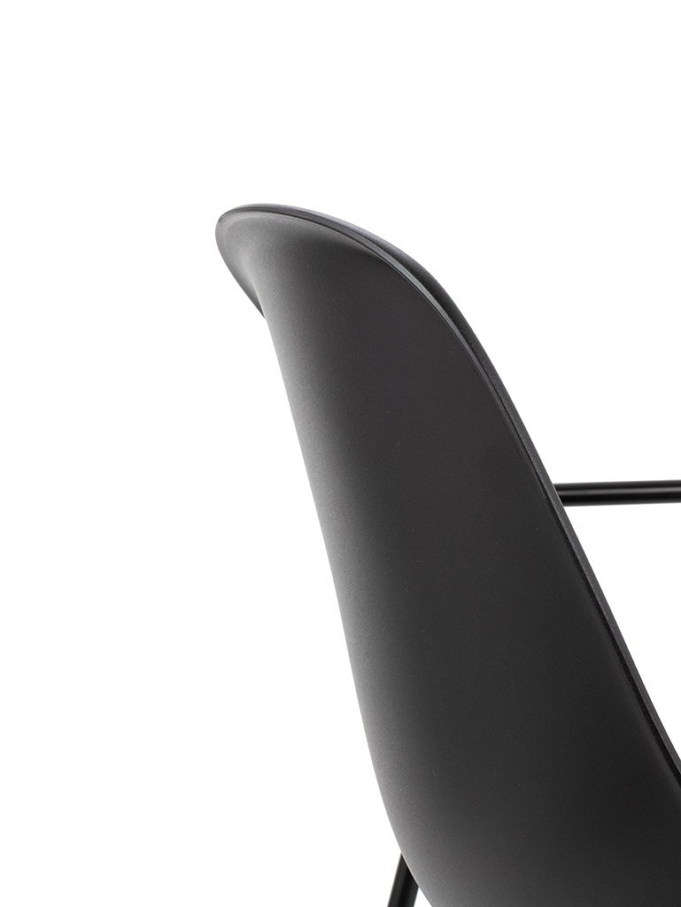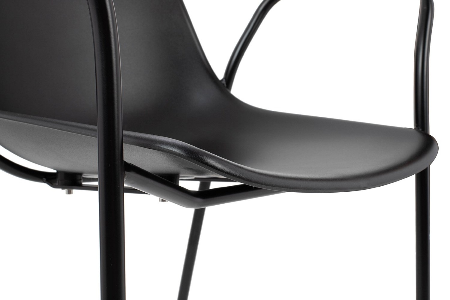 Siedzisko zostało wykonane z polipropylenu w kolorze czarnym, a podstawa i podłokietniki z metalu lakierowanego na czarno.