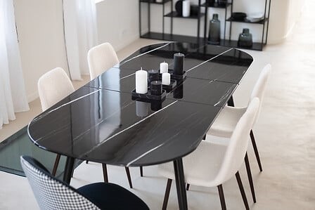 Krzesło Roka łączy oryginalny kształt z komfortem użytkowania. Tapicerka z modnej tkaniny boucle lub aksamitnego materiału VIC nadaje mu elegancki wygląd i przyjemną fakturę. Wbudowane podłokietniki zwiększają wygodę, a prosta konstrukcja z metalowymi nogami zapewnia stabilność. Idealne do jadalni, salonu lub nowoczesnego gabinetu.