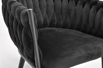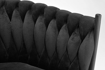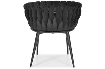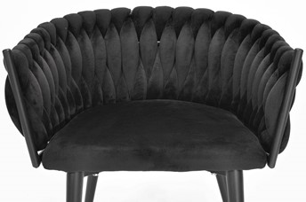 Zestawienie delikatnej czarnej welurowej tkaniny z plecionym, geometrycznym oparciem tworzy efektowną kombinację, która wyróżnia się w każdym wnętrzu. To krzesło to nie tylko mebel, ale również dzieło sztuki, które przyciąga uwagę swoją elegancją i stylem.