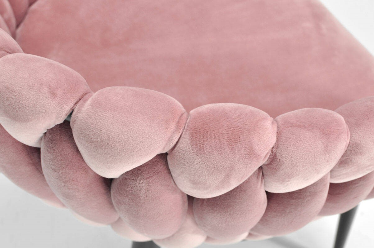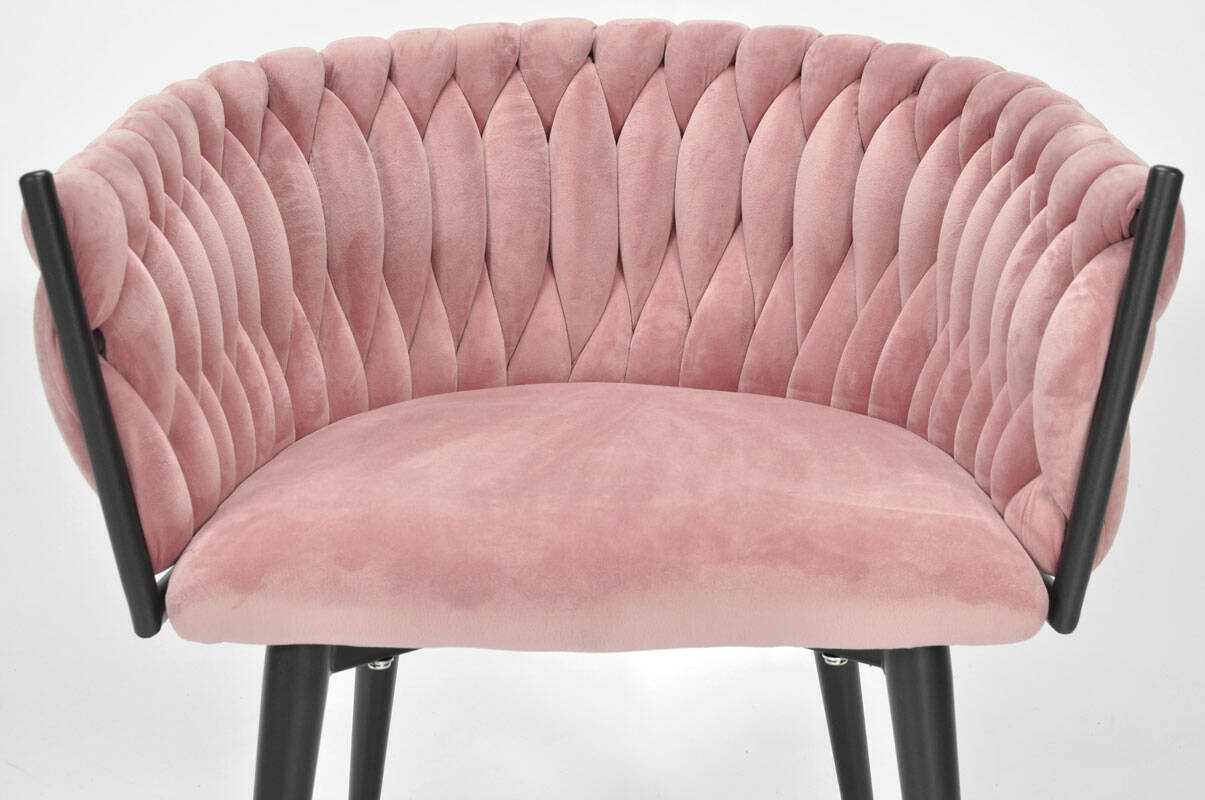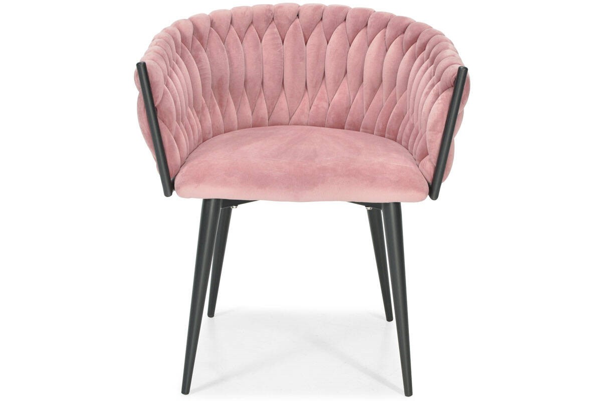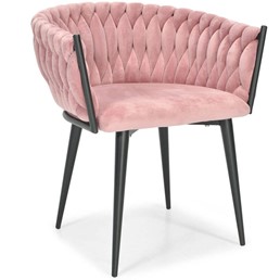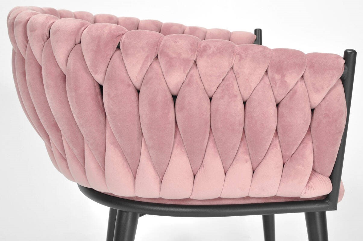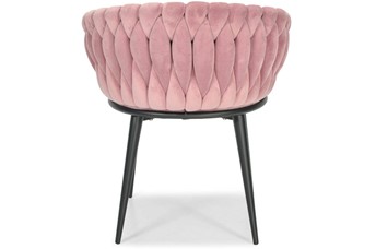Zestawienie delikatnej różowej welurowej tkaniny z plecionym, geometrycznym oparciem tworzy efektowną kombinację, która wyróżnia się w każdym wnętrzu. To krzesło to nie tylko mebel, ale również dzieło sztuki, które przyciąga uwagę swoją elegancją i stylem.