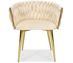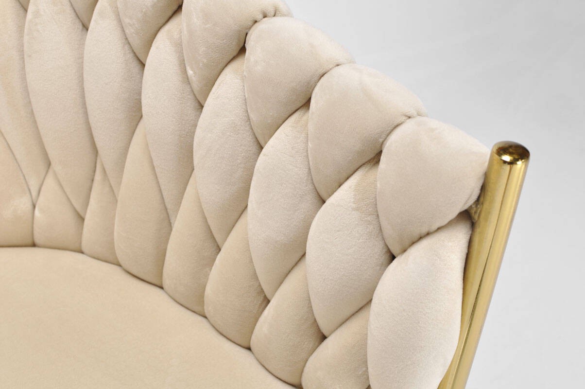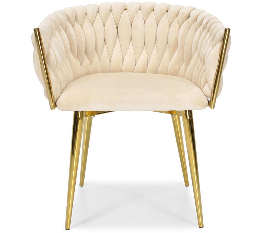 Dodaj wyjątkowy akcent glamour do swojego wnętrza z krzesłem ROSA. Wysokiej jakości beżowa tkanina welurowa, pięknie plecione oparcie i złote nogi nadają mu niepowtarzalny urok, idealnie wpisując się w estetykę glamour i Art Deco.