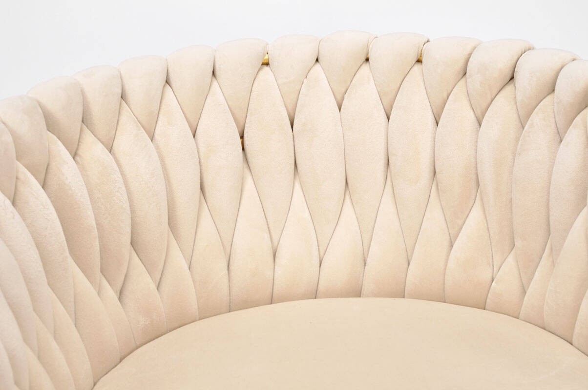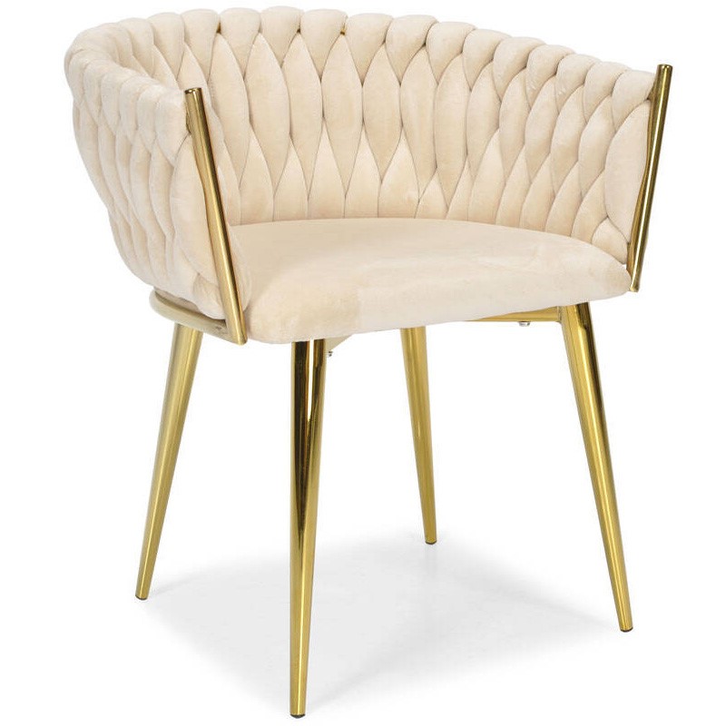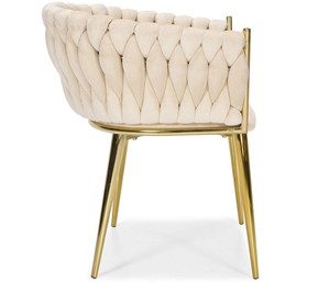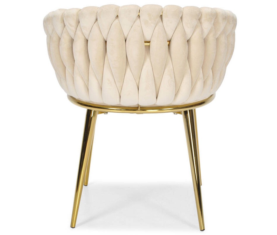 Zestawienie delikatnej beżowej welurowej tkaniny z plecionym, geometrycznym oparciem tworzy efektowną kombinację, która wyróżnia się w każdym wnętrzu. To krzesło to nie tylko mebel, ale również dzieło sztuki, które przyciąga uwagę swoją elegancją i stylem.