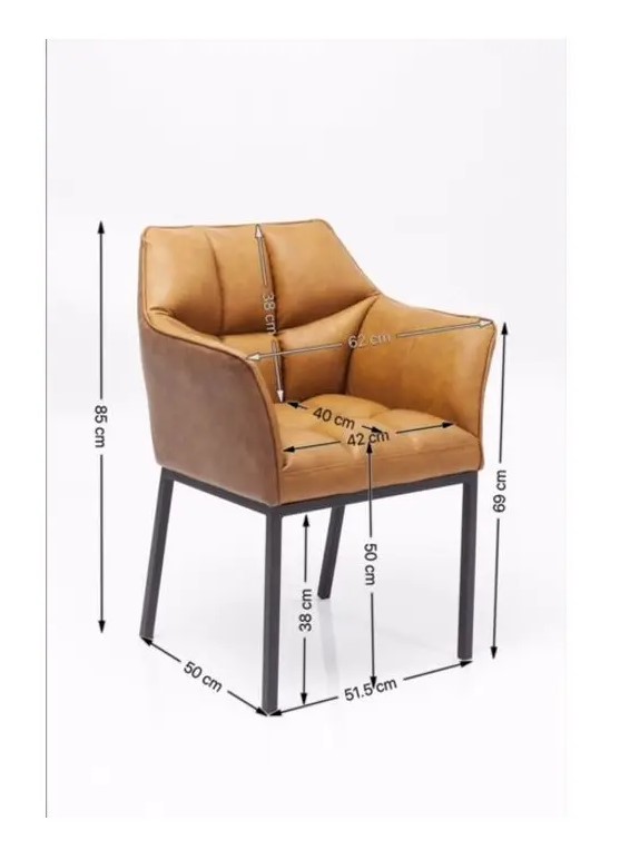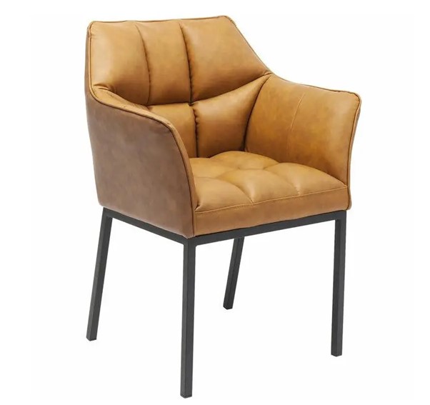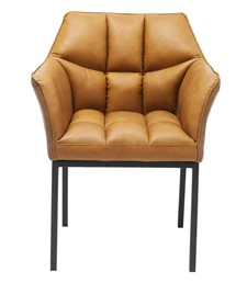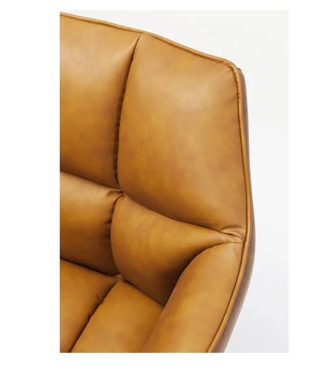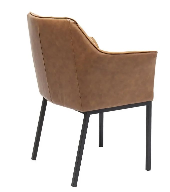 Wygodne siedzisko o kształcie muszli z zaokrąglonymi podłokietnikami wykonano z brązowej skóry a czarną matową podstawę ze stali.