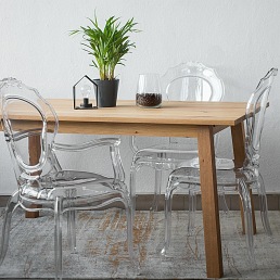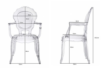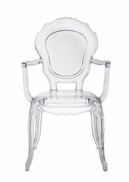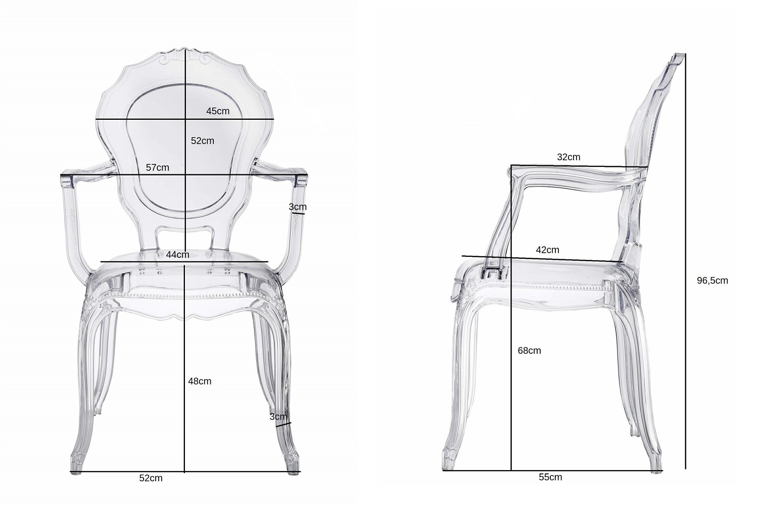 Nowoczesne krzesło transparentne Queen Arm to perfekcyjna forma zamknięta w meblu użytkowym. Transparentne krzesło Queen wykonane zostało z tworzywa wykończonego w połysku, co sprawia, że jego utrzymanie w czystości nie sprawi najmniejszego problemu. Krzesło z podłokietnikami wykonane zostało w stylu Glamour. Ozdobne wykończenia na podstawie krzesła, podłokietnikach, jak i na górnej części jego siedziska sprawiają, że krzesło jest niezwykle designerskie oraz nowoczesne. Krzesło transparentne Queen doskonale sprawdzi się jako krzesło do wszelkich uroczystości, krzesło do jadalni czy też krzesło do biurka. Krzesło można sztaplować, nie wymaga montażu, maksymalne obciążenie wynosi 120kg. Max. ilość sztuk w pudełku: 2 Wymiary kartonu:67,5cm x 131cm x 58cm