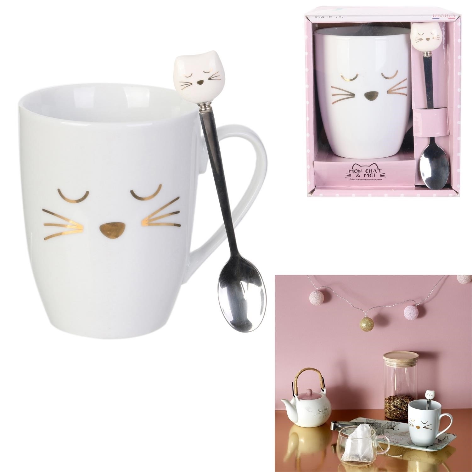 Kubek Kotek z łyżeczką o pojemności 350 ml to uroczy dodatek do Twojej kawowej rutyny. Wykonany z ceramiki, posiada złote zdobienia w kształcie kociaka, a na metalowej łyżeczce widnieje porcelanowa główka kota. Idealny prezent dla miłośników kotów, a także dla nastolatków. Kubek jest pakowany w ozdobne pudełko, co sprawia, że jest jeszcze bardziej wyjątkowy. Kubek nie tylko zachwyca designem, ale także jest bardzo praktyczny. Można go myć w zmywarce i używać w mikrofalówce, co sprawia, że jest to wygodne i szybkie rozwiązanie w domowej rutynie.