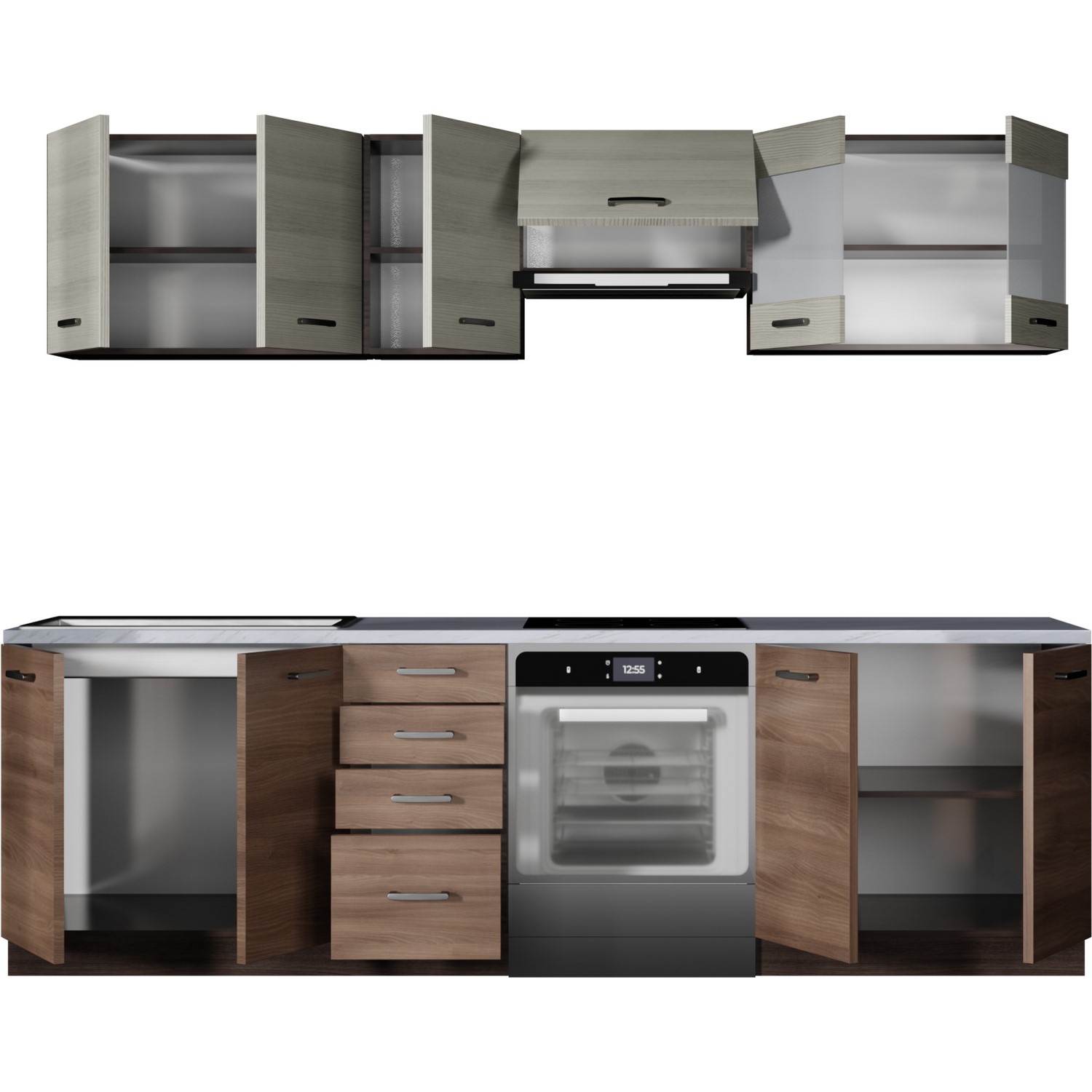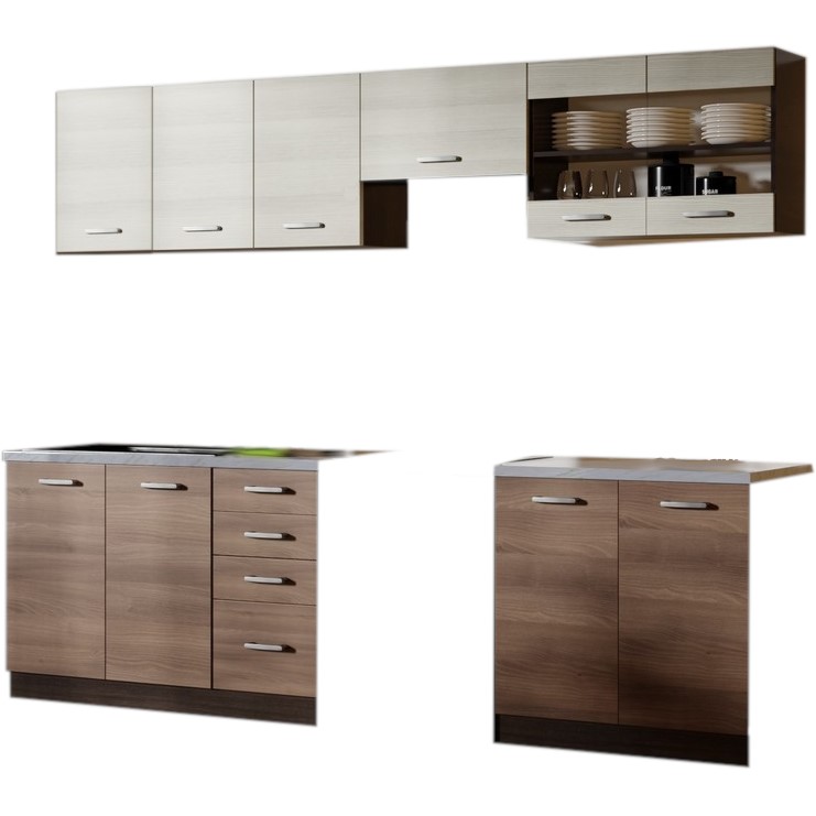 Zestaw kuchenny AMANDA 2 to klasyka w nowoczesnym wydaniu. Ten elegancki, a jednocześnie praktyczny w codziennym użytkowaniu mebel wyposażony jest w podnośnik gazowy, dzięki któremu poszczególne szafki można łatwo i szybko otworzyć. Fronty szafek i szuflad wykonane są z płyt MDF w kolorze akacji cynamonowej i dębu navara. Te wspaniałe meble kuchenne można wstawić do pomieszczeń zaaranżowanych w stylu klasycznym lub nowoczesnym. To oferta stworzona dla Ciebie!