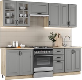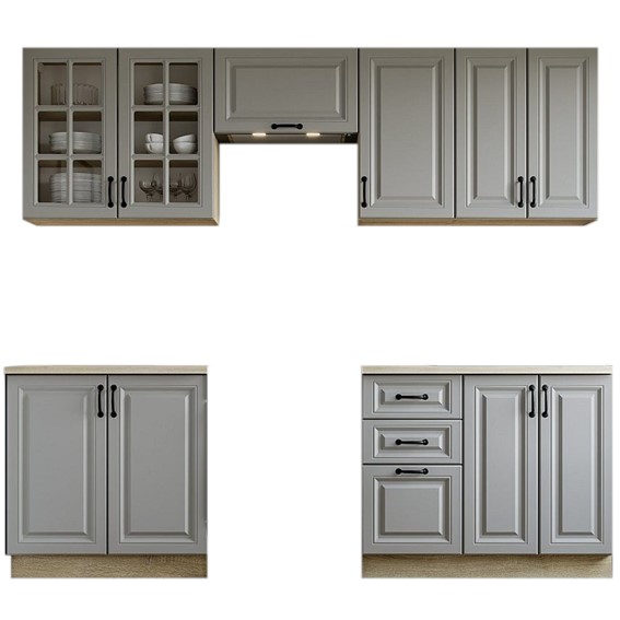 Zestaw mebli kuchennych to znakomita inwestycja do twojego meiszkana. Dzięki niej masz zapewniony cały komplet mebli w atrakcyjnej cenie. Zestaw kuchenny ELIZABETH zawiera górne oraz dolne szafki w kolorze szarym, może wspaniale uzupełnić aranżację Twojej kuchni. Blat w kolorze dąb sonoma ociepla optycznie całość, nadając zestawowi przytulnego charakteru.Frezy na frontach mebli to subtelne i eleganckie zdobienie, które podkreśli piękno koloru popielatego i nada meblom wyjątkowego uroku. Kolor ten jest ponadczasowy i pasuje do wielu innych barw, co pozwoli Ci na łatwe dopasowanie mebli do wystroju kuchni. Solidne materiały, sprawią że kuchnia posłuży Ci przeez wiele lat.