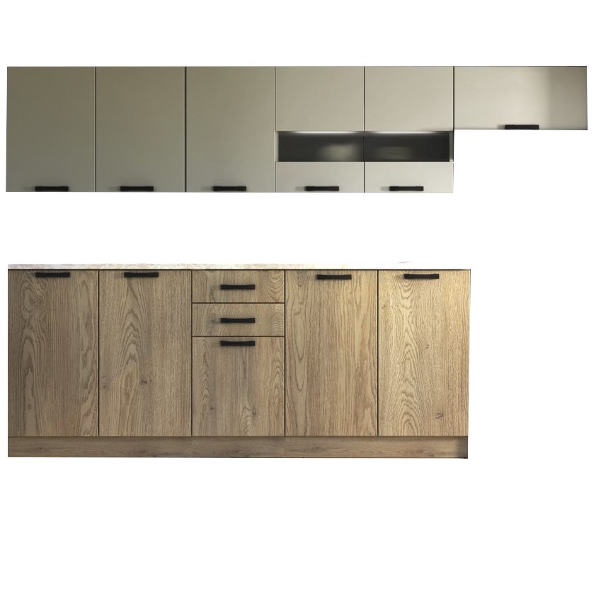 Zestaw mebli kuchennych to idealne rozwiązanie dla osób ceniących funkcjonalność i estetykę w kuchni. Nowoczesny design połączony z wysokiej jakości materiałami sprawia, że meble są zarówno stylowe, jak i trwałe. Przemyślane rozmieszczenie szafek i szuflad zapewnia wygodną organizację przestrzeni, ułatwiając przechowywanie naczyń i akcesoriów kuchennych. Solidne blaty są odporne na zarysowania, wilgoć oraz wysokie temperatury, co gwarantuje ich długowieczność. Ergonomiczne uchwyty i systemy cichego domykania zwiększają komfort codziennego użytkowania.