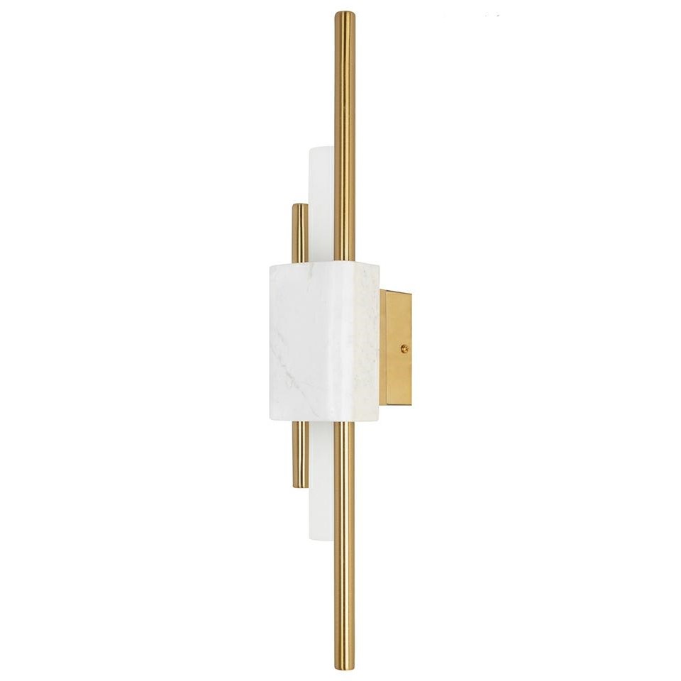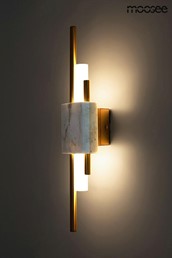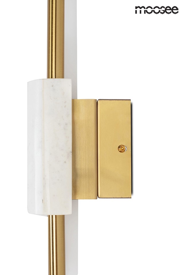 Lampa ścienna MOOSEE EVANS w kolorze białym i złotym. Połączenie tradycyjnego stylu z nowoczesnym podejściem. Złote, długie detale optycznie podkreślają długość kinkietu. Klosze z mrożonego szkła kryją diodowe źródła światła o ciepłym odcieniu, a strumień światła skierowany jest zarówno w górę, jak i w dół. Centralny element tworzy klamra z autentycznego marmuru, co sprawia, że każda sztuka jest niepowtarzalna. Model Evans doskonale wzbogaci przestrzeń domową, restauracyjną czy hotelową.