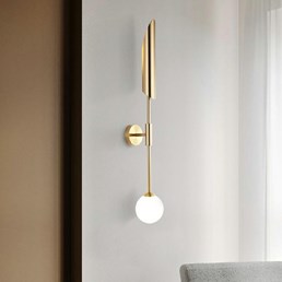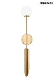 Złoty kinkiet LUCCA. Wykonany ze stali w kolorze złotym i opalizującego szklanego klosza. Źródło światła przymocowane jest zarówno do górnej, jak i dolnej części kinkietu, Ukryte są pod różnymi materiałami, tworząc niepowtarzalne efekty świetlne.