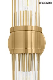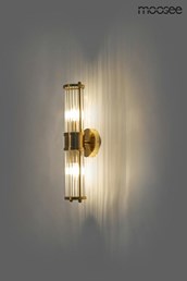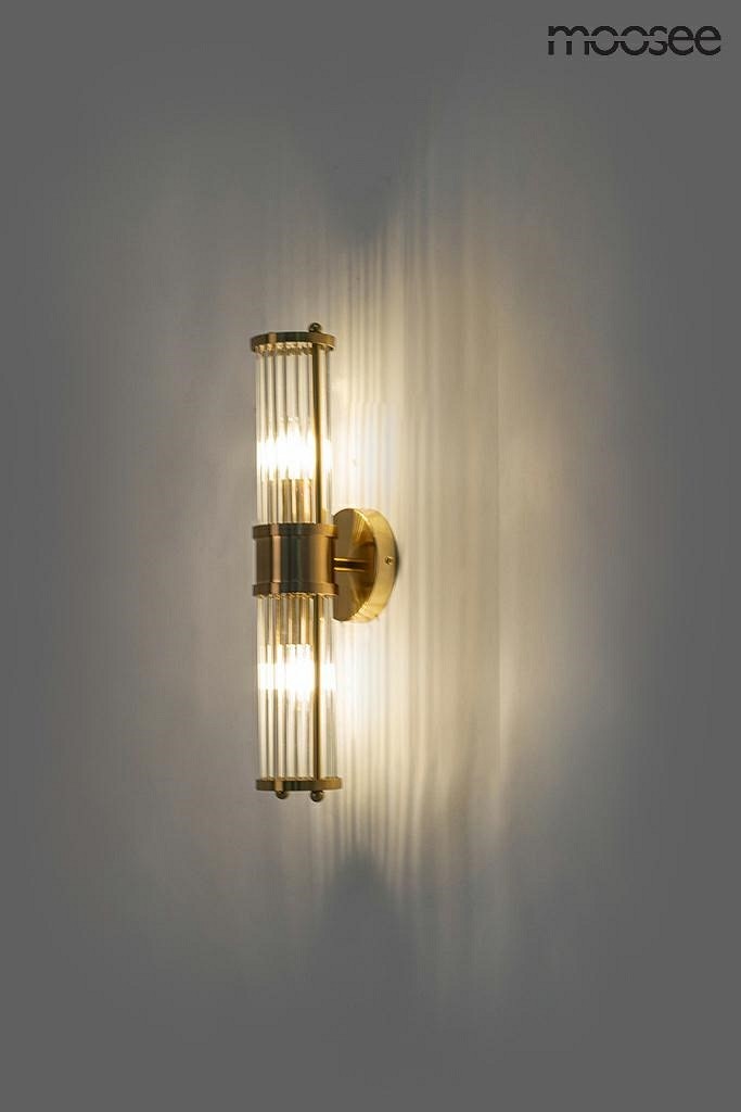 Lampa ścienna PILAR TWIN złoty. Elegancka osłona klosza wykonana jest ze stali w kolorze złotym. Wewnątrz lampy znajduje się delikatny kryształowy klosz, który kieruje źródło światła w górę i w dół, tworząc oszałamiający efekt świetlny.