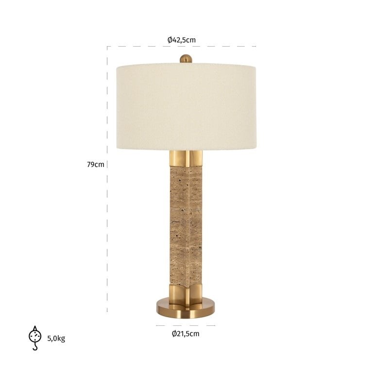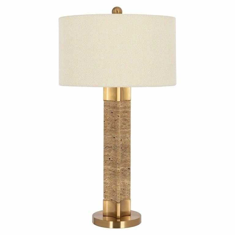 Klasyczny klosz w jasnej kolorystyce świetnie kontrastuje z marmurową podstawą w brązowych tonacjach, ozdobioną złotymi akcentami.