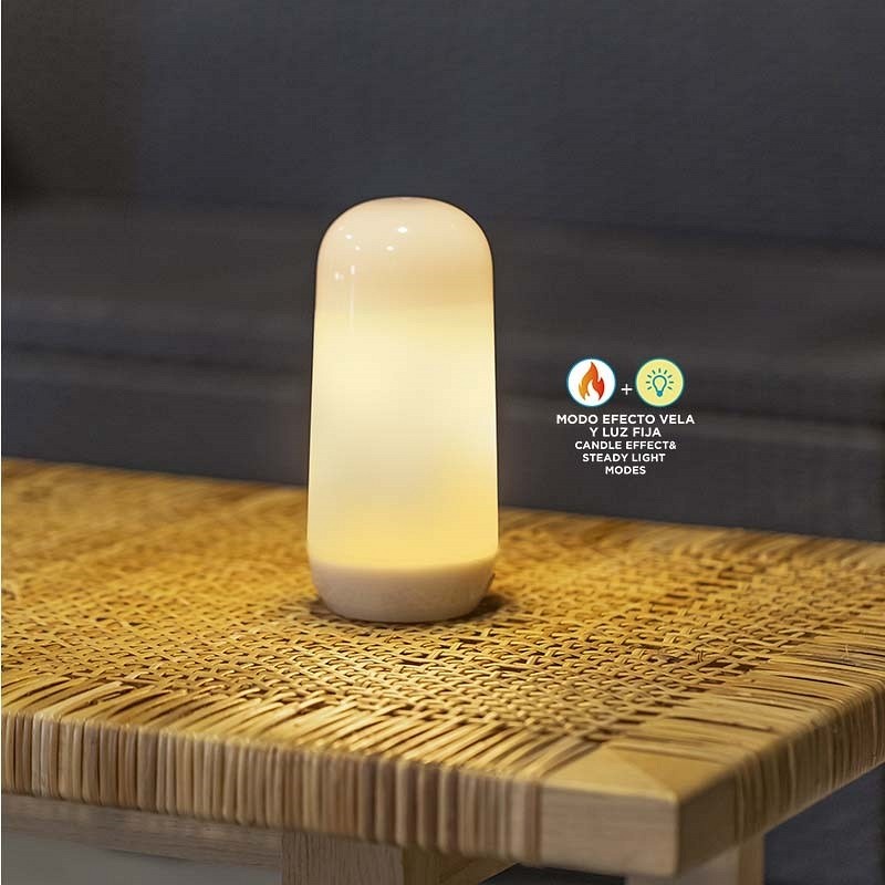 Lampa stołowa GARDEN CANDY. Ramię lampy nie musi być instalowane, wystarczy powiesić lub zbliżyć je do metalowego obszaru, a światło będzie się trzymać dzięki podstawie magnetycznej. Ma 200 lumenów i świeci przez 6-20 godzin po naładowaniu, w zależności od natężenia światła. W zestawie pilot do włączania, wyłączania, regulacji funkcji światła ciągłego i efektu płomienia.