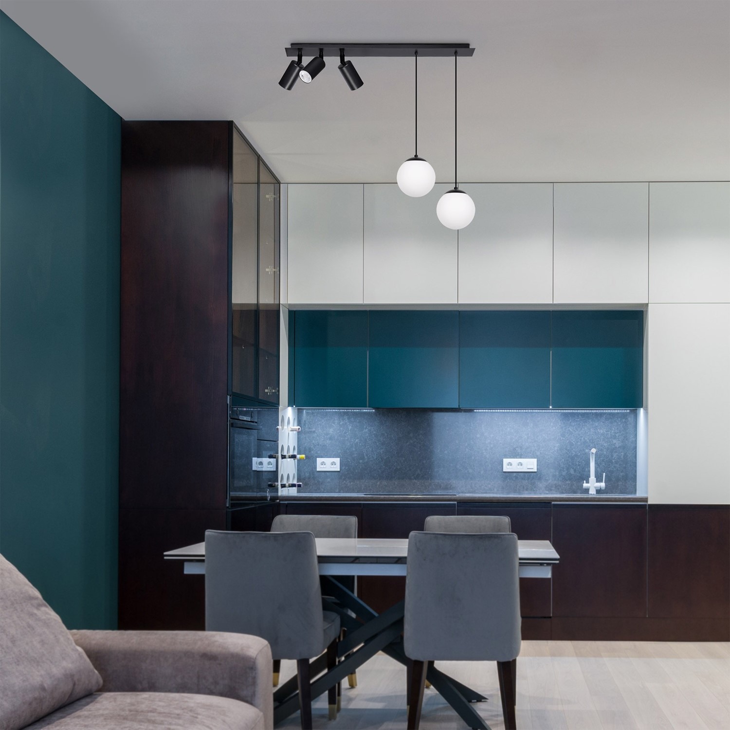 Prezenotwana lampa sufitowa to nowoczesne połączenie stylu loftowego z klasyczną elegancją. Jej niebanalna konstrukcja łączy reflektory z surowym, industrialnym charakterem oraz szklany klosz w mlecznym wykończeniu. Dzięki podłużnej formie świetnie sprawdzi się nad stołem lub wyspą kuchenną, doświetlając równomiernie całą powierzchnię. Lampa nie dominuje aranżacji, lecz harmonijnie się w nią wpisuje, dodając wnętrzu wyrazistości. Wykonana z trwałego metalu i szkła wysokiej jakości, gwarantuje długotrwałe użytkowanie.