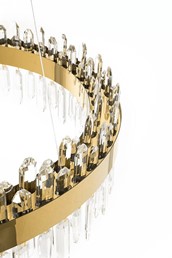 Lampa wisząca AMIRA 80 to kwintesencja elegancji i luksusu. Jej złota obręcz ozdobiona błyszczącymi kryształami tworzy spektakularne efekty świetlne, które dodadzą blasku każdemu nowoczesnemu wnętrzu. Ta ekskluzywna oprawa oświetleniowa została zaprojektowana z myślą o miłośnikach glamour i wyszukanego designu.