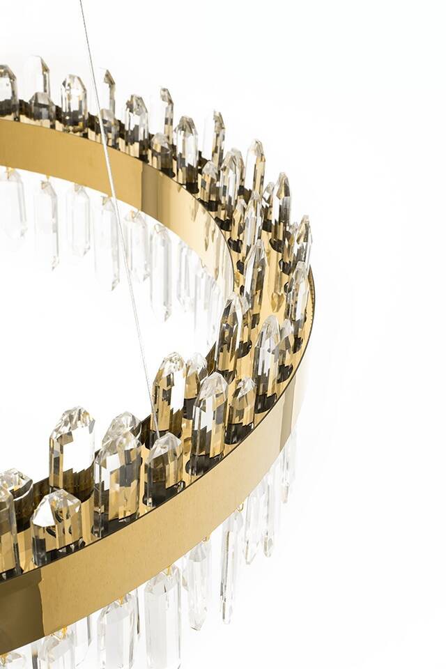 - Złote przebłyski: Delikatne przebijanie się złotego koloru przez przezroczyste kryształy dodaje subtelności i ciepła, rozpraszając światło w przestrzeni.