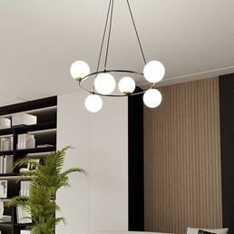 Lampa wisząca AZURA 6 to propozycja wprowadzająca elegancję minimalistycznego designu do każdego wnętrza. Została wykonana ze stali w kolorze czarnym, doskonale komponując się z białym kloszem. Jej kształt w formie okręgu z nieregularnie rozmieszczonymi kloszami nadaje wnętrzu wyjątkową atmosferę, podkreślając jednocześnie jego nowoczesny i wytworny charakter. Jest to doskonały wybór dla osób poszukujących sposobu na dodanie oryginalności swojemu wnętrzu, tworząc oświetlenie, które nie tylko spełnia funkcjonalne potrzeby, ale także wyróżnia się estetyką.