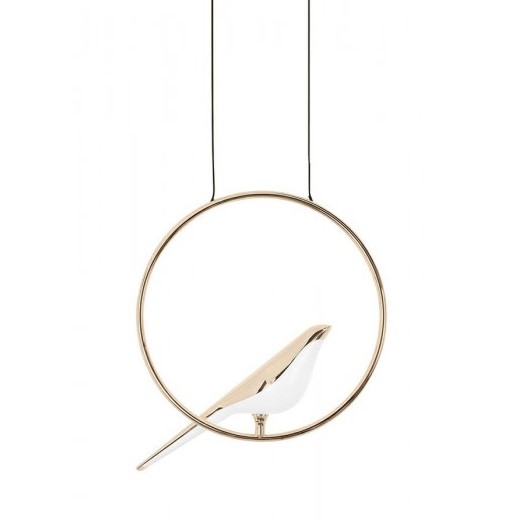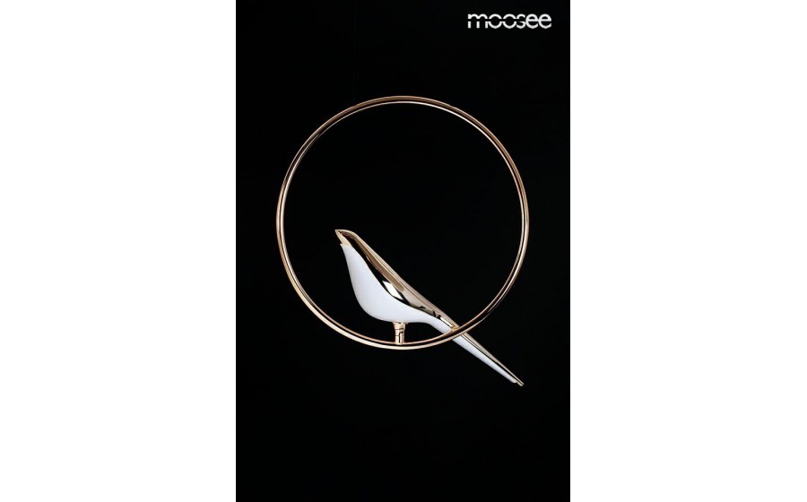 Lampa wisząca BIRD w kolorze złotym to wyjątkowe połączenie nowoczesnego designu z delikatnym, przyrodniczym motywem. Centralnym elementem lampy jest biało-złoty ptaszek, który zawieszono na złotym okręgu. Ten dodatek nadaje oświetleniu nie tylko unikalny wygląd, ale także naturalny i lekki charakter. Ptak został zamocowany czarnym przewodem do podłużnej, metalowej podsufitki w kolorze czarnym, co dodaje lampie dodatkowego kontrastu i charakteru. Lampa wisząca Bird nie tylko dostarcza przyjemne oświetlenie, ale staje się również wyjątkowym elementem dekoracyjnym. Możliwość tworzenia spójnych aranżacji z innymi elementami tej kolekcji sprawia, że można łatwo dostosować oświetlenie do charakteru danego pomieszczenia.