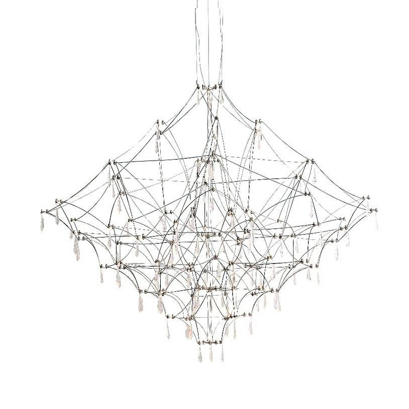 Lampa Constelation 100. Konstrukcja lampy wykonana została ze stali szczotkowanej. Metalowa pajęczyna, połączona z ledowymi źródłami światła tworzy wyjątkowo elegancką konstrukcję. Całość została wykończona dekoracyjnymi kryształkami. Długość z kablem: 350 cm Źródło światła: LED x 0,8 W 3000 K Waga netto 1 szt.: 18 kg Waga opakowania: 20 kg Maksymalna ilość szt. w opakowaniu: 1 Wymiary opakowania: 105 cm x 105 cm x 45 cm Sposób wysyłki: Paczka gabarytowa. Produkt do samodzielnego montażu: Tak