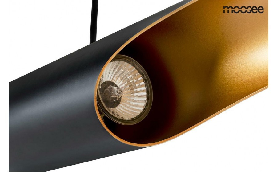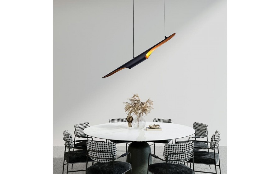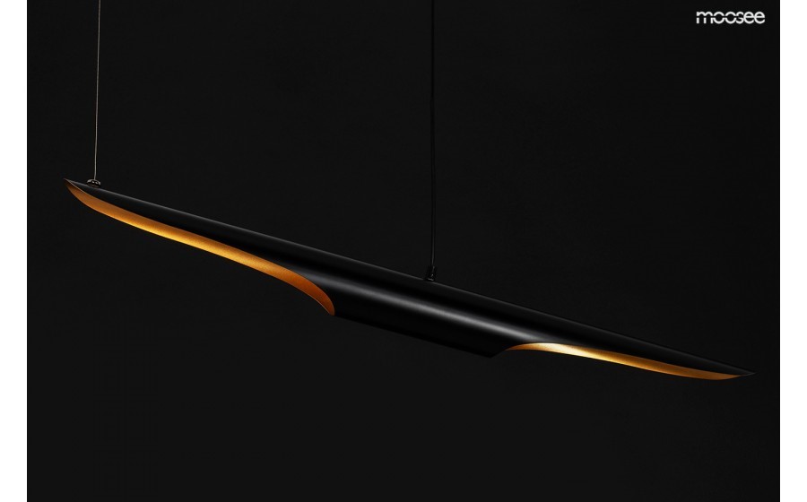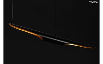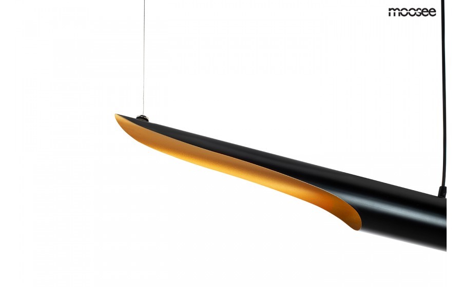 <p><strong>• Elegancki czarny kolor ze złotym akcentem</strong></p> <p><strong>• Idealnie pasuje do nowoczesnych wnętrz</strong></p> <p><strong>• Wykonany z formowanego aluminium</strong></p> <p> </p> <p>Lampa wisząca CONTEO to designerski element oświetleniowy, wykonany z formowanego aluminium w eleganckim, matowym czarnym kolorze. Jej wyjątkowy design wyróżnia się nie tylko estetyką, ale także funkcjonalnością. Wewnętrzna strona klosza, utrzymana w złotym kolorze, nie tylko nadaje lampie wyjątkowego charakteru, ale również doskonale rozprasza światło, tworząc ciepłą atmosferę w pomieszczeniu. Cała konstrukcja zawieszona jest w charakterystyczny sposób na czarnej podsufitce, przewodzie w oplocie oraz stalowej linie, co nadaje lampie lekkości i nowoczesności. Lampa CONTEO z powodzeniem może zdobić przestrzeń nad stołem w jadalni, barem lub recepcją w hotelu.</p> <p>Klosz: dł.100cm / śr.8cm<br /> Mocowanie: śr.10cm / wys.11cm<br /> Element mocowania linek do sufitu: wys.3,5cm / śr.1,5cm<br /> Przewód: 170cm</p>