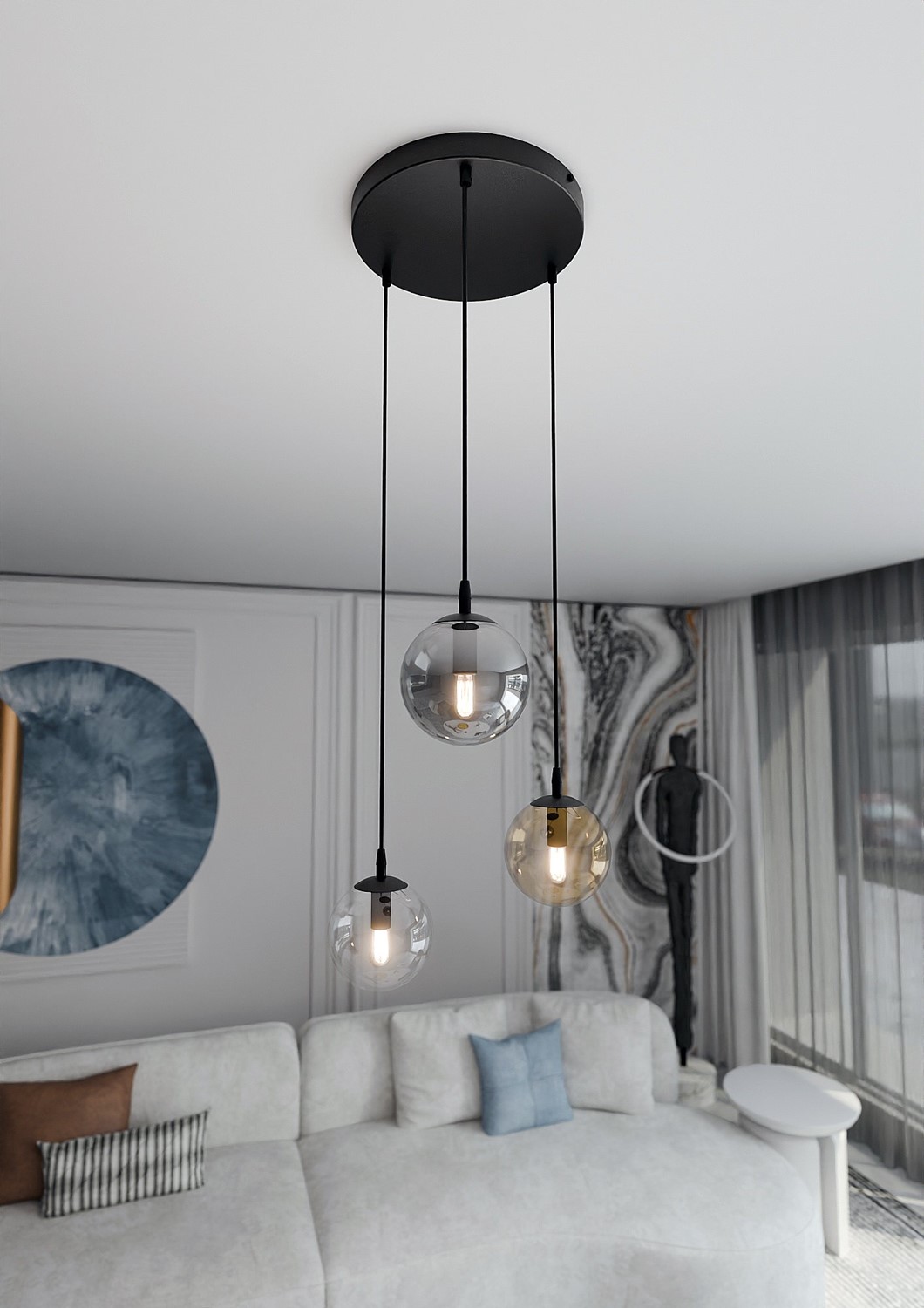 Lampa wisząca COSMO to element uniwersalny i ponadczasowy, który doskonale pasuje do różnorodnych wnętrz. Jej minimalistyczny styl harmonizuje z najnowszymi trendami, jednocześnie zachowując elegancję, która nigdy nie wychodzi z mody. Najmodniejsze szklane klosze lampy COSMO zapewniają doskonałe doświetlenie pomieszczenia, tworząc przyjemną atmosferę i nadając mu charakteru. Dzięki wysokim standardom produkcji, lampa wisząca COSMO nie tylko świetnie prezentuje się w każdym pomieszczeniu, ale również zapewnia trwałość i zadowolenie z użytkowania.