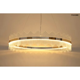Lampa wisząca FLORENS to prawdziwie ekskluzywna aranżacja świetlna, która wprowadza do wnętrza zarówno klasyczny, jak i nowoczesny wyrafinowany styl. Ta lampa nie tylko oświetla przestrzeń, ale stanowi również znakomitą ozdobę, wzbogacającą każde pomieszczenie o niezwykłą elegancję. Centralnym elementem lampy jest złota metalowa obręcz, na której umieszczono szklane, transparentne klosze w dwurzędzie. Ta precyzyjnie zaprojektowana kompozycja tworzy efekt kryształu, który emanuje luksusem i finezją. Klosze nadają lampie unikalny charakter, a jednocześnie skutecznie rozpraszają światło, tworząc przyjemną i efektowną atmosferę. Światło emitowane przez lampę FLORENS jest skierowane zarówno w górę, jak i w dół, co nie tylko zapewnia optymalne oświetlenie przestrzeni, ale także tworzy niesamowity efekt wizualny.