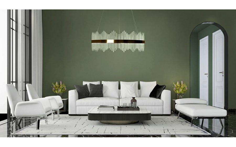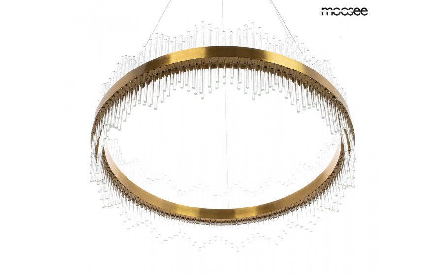 Lampa wisząca FLORENS to prawdziwie ekskluzywna aranżacja świetlna, która wprowadza do wnętrza zarówno klasyczny, jak i nowoczesny wyrafinowany styl. Ta lampa nie tylko oświetla przestrzeń, ale stanowi również znakomitą ozdobę, wzbogacającą każde pomieszczenie o niezwykłą elegancję. Centralnym elementem lampy jest złota metalowa obręcz, na której umieszczono szklane, transparentne klosze w dwurzędzie. Ta precyzyjnie zaprojektowana kompozycja tworzy efekt kryształu, który emanuje luksusem i finezją. Klosze nadają lampie unikalny charakter, a jednocześnie skutecznie rozpraszają światło, tworząc przyjemną i efektowną atmosferę. Światło emitowane przez lampę FLORENS jest skierowane zarówno w górę, jak i w dół, co nie tylko zapewnia optymalne oświetlenie przestrzeni, ale także tworzy niesamowity efekt wizualny.