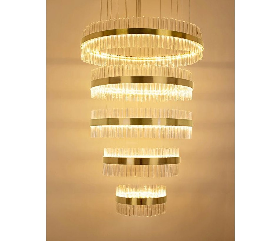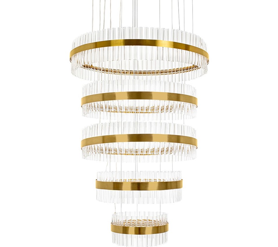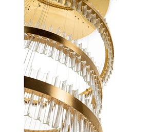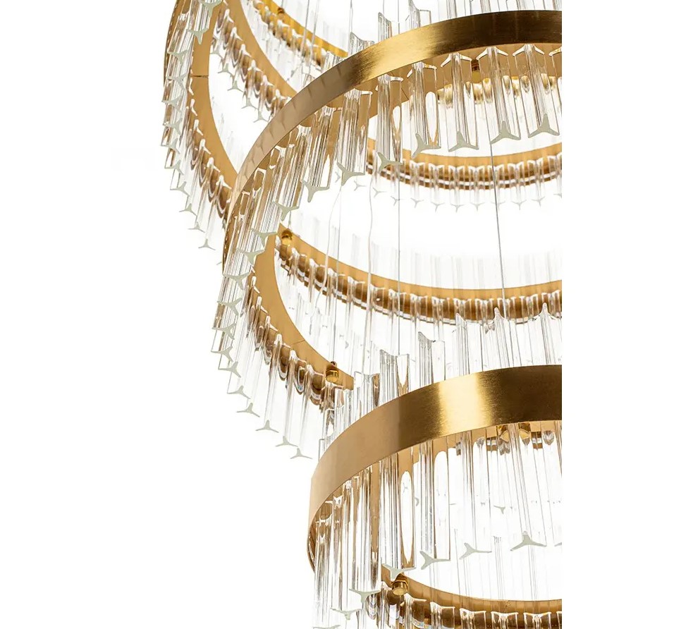 Lampa wisząca GHIA 5 złota to esencja nowoczesnego luksusu i wyrafinowanego designu. Jej imponująca oprawa, składająca się z pięciu stalowych ringów w szykownym złotym kolorze, rozświetli każde wnętrze, tworząc spektakularny efekt wizualny. Szklane, przezroczyste klosze dodają elegancji, a ręcznie obrabiane szkło z pęcherzykami powietrza podkreśla unikatowy charakter lampy.