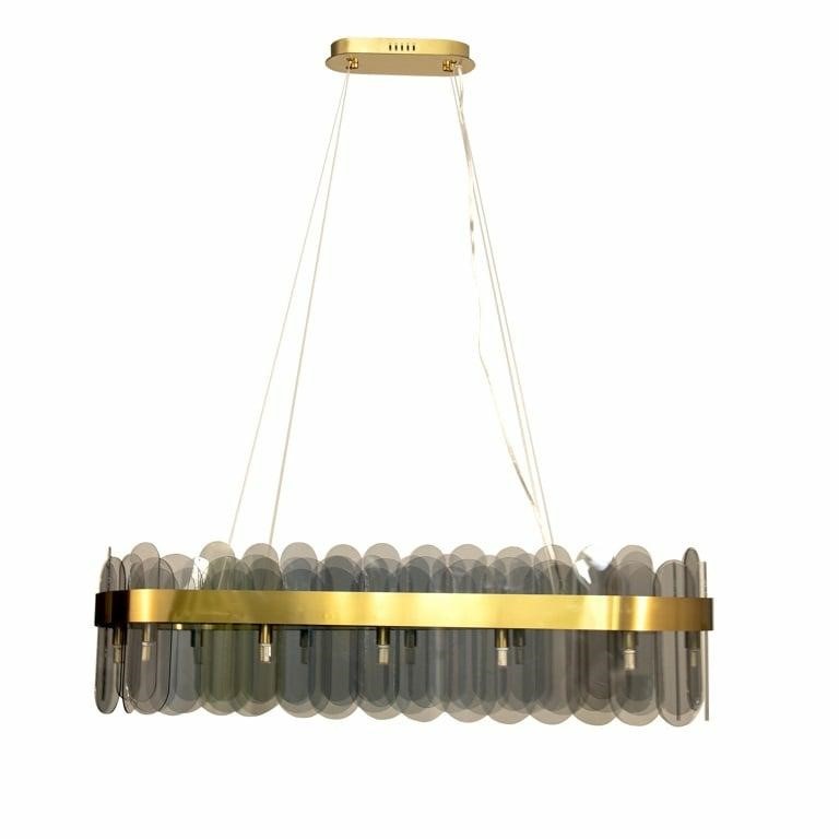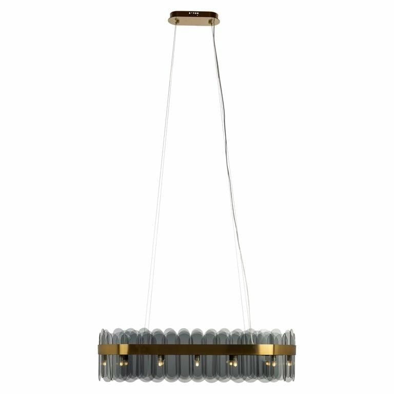 Na eleganckiej metalowej obręczy w kolorze szczotkowanego zlota, umieszczono wiele ciemnych szklanych kloszy.