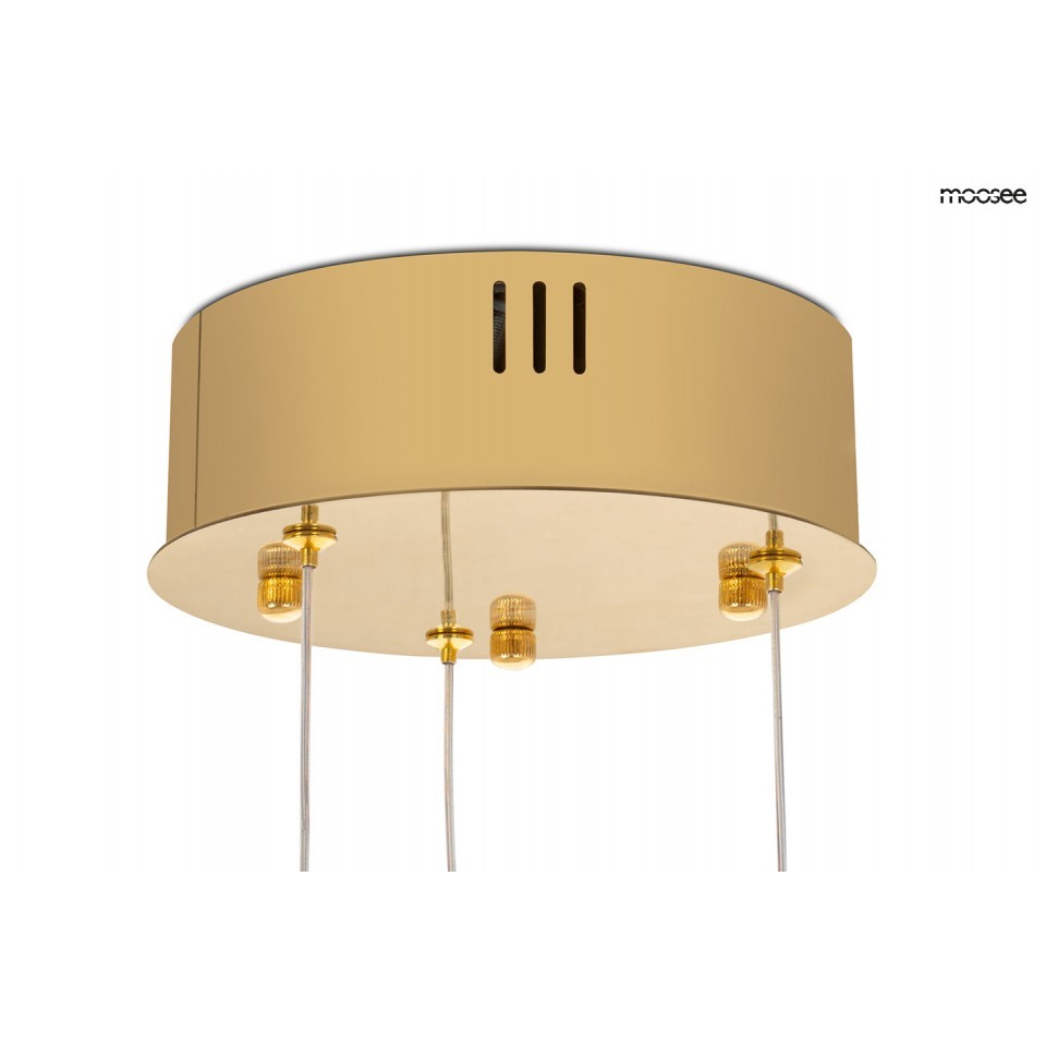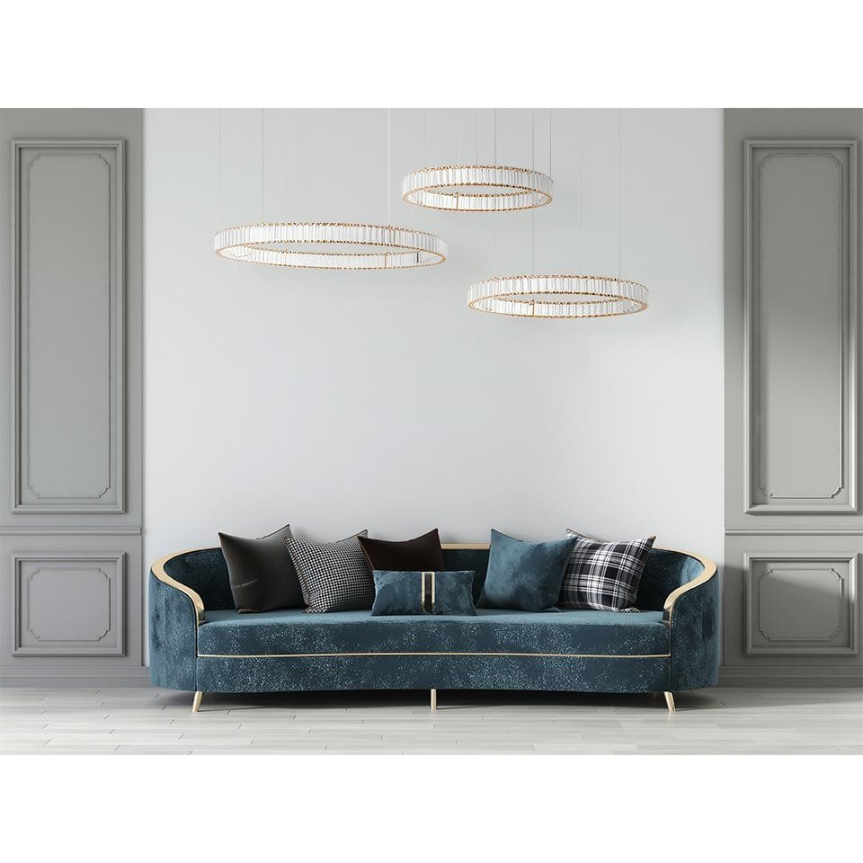 Lampa wisząca LIBERTY 3B to kwintesencja ekskluzywności i elegancji, która z powodzeniem ozdobi wnętrza klasyczne, nowoczesne oraz glamour. Ta wyjątkowa oprawa nie tylko dostarcza światła, ale stanowi również majestatyczną dekorację, której urok przyciąga spojrzenia i dodaje wyjątkowego charakteru każdemu pomieszczeniu. Ozdobne obręcze lampy LIBERTY 3B zostały wykończone złotym kolorem, który delikatnie przebija się przez kryształy, tworząc efekt dekoracyjny pełen blasku i splendoru. Kryształowe szkło, umieszczone po obu stronach obręczy, w niezwykły sposób rozprasza strumień światła, tworząc piękny efekt świetlny, który nadaje pomieszczeniu niepowtarzalnej atmosfery. Trzy okręgi o różnych rozmiarach zawieszone na cienkich linkach z możliwością regulacji wysokości dają możliwość tworzenia kreatywnych konfiguracji, dostosowując lampę do indywidualnych preferencji aranżacyjnych.