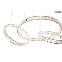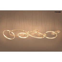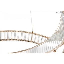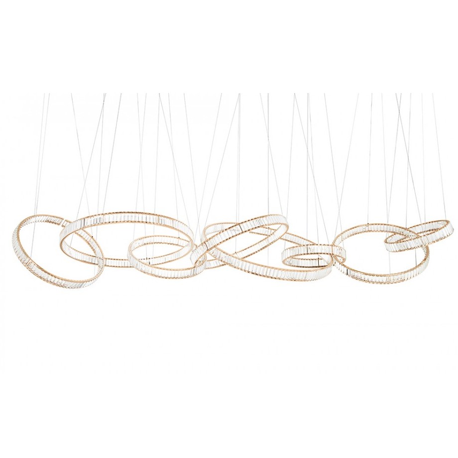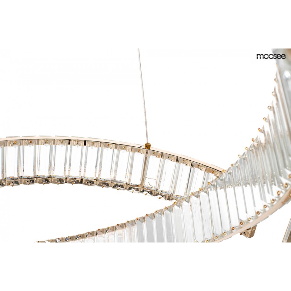 Lampa wisząca LIBERTY LINE 8 to kwintesencja ekskluzywności i elegancji, która z powodzeniem ozdobi wnętrza klasyczne, nowoczesne oraz glamour. Ta wyjątkowa oprawa nie tylko dostarcza światła, ale stanowi również majestatyczną dekorację, której urok przyciąga spojrzenia i dodaje wyjątkowego charakteru każdemu pomieszczeniu. Ozdobne obręcze lampy LIBERTY LINE 8 zostały wykończone złotym kolorem, który delikatnie przebija się przez kryształy, tworząc efekt dekoracyjny pełen blasku i splendoru. Kryształowe szkło, umieszczone po obu stronach obręczy, w niezwykły sposób rozprasza strumień światła, tworząc piękny efekt świetlny, który nadaje pomieszczeniu niepowtarzalnej atmosfery. Okręgi o różnych rozmiarach zawieszone na cienkich linkach z możliwością regulacji wysokości dają możliwość tworzenia kreatywnych konfiguracji, dostosowując lampę do indywidualnych preferencji aranżacyjnych.