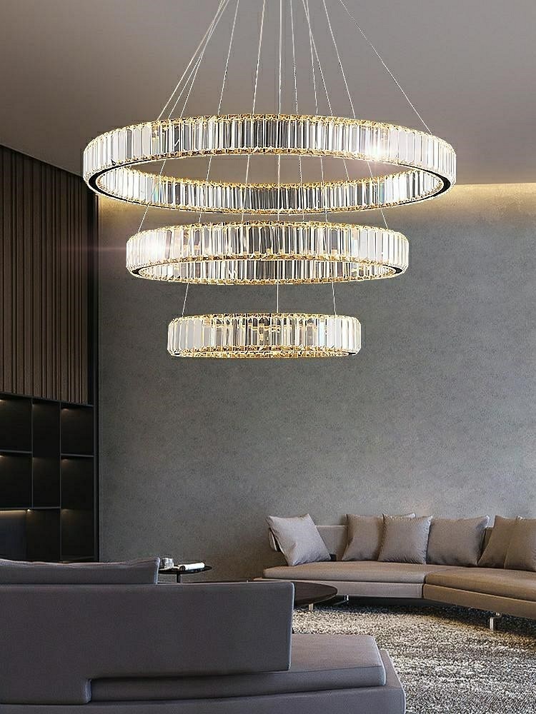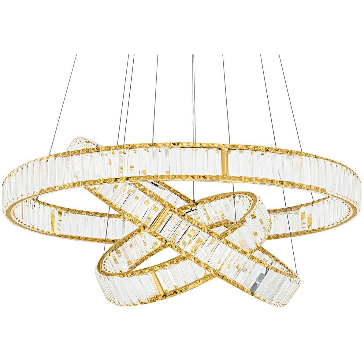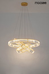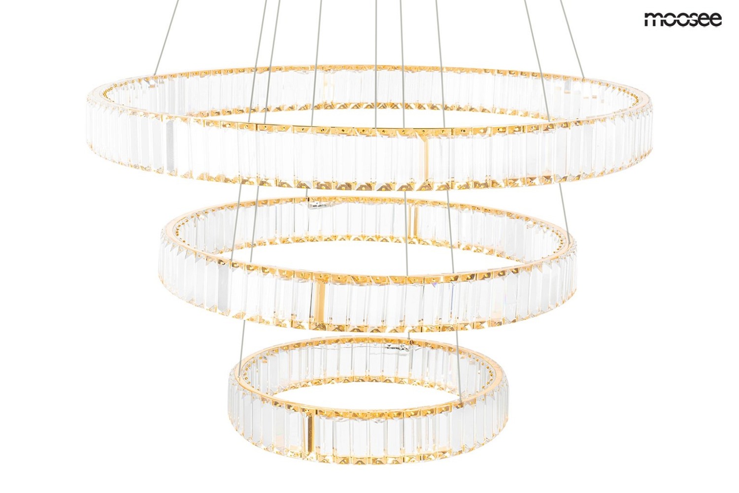 Złota lampa wisząca LIBERTY TRIPLE MOOSEE. Elegancki i ekskluzywny zestaw lamp z powodzeniem ozdobi klasyczne, nowoczesne i pełne uroku wnętrze. Kryształowe kieliszki zamontowane po obu stronach oprawy w niezwykły sposób rozpraszają strumień świetlny. Delikatny złoty kolor przechodzący przez kryształki tworzy wspaniały efekt dekoracyjny. Kręgi o różnych rozmiarach zwisają z cienkich linek z możliwością regulacji wysokości na różne sposoby, co pozwala tworzyć kreatywne konfiguracje kół. Najlepiej wyglądają wiszące kaskadowo.