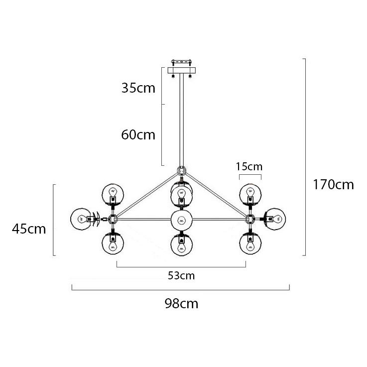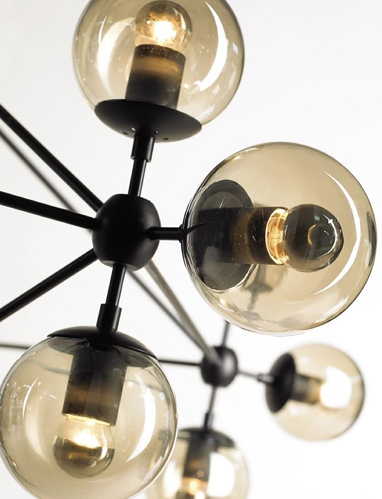 Lampa Planetario 10. Konstrukcja lampy wykonana została z metalu w kolorze czarnym matowym. Całość dopełnia 10 okrągłych kloszy. Klosze wykonane są z dymionego szkła. Dzięki temu światło jest ciepłe i przyjemne. Lampa doskonale sprawdzi się w salonie lub jadalni. Lampa dostępna jest też innych rozmiarach z kloszami transparentnymi. Źródło światła: 10 x E27 MAX 40W Źródło światła w zestwie: Nie Maksymalna ilość szt. w opakowaniu: 1 Wymiary opakowania: 95 cm x 81 cm x 26 cm Waga produktu: 6 kg Waga z opakowaniem: 13,5 kg Sposób wysyłki: Paleta Produkt do samodzielnego montażu: Tak