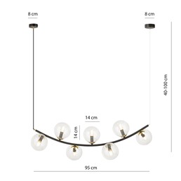 Lampa Wisząca RITZ 7 to propozycja wprowadzająca prostotę minimalistycznego designu do każdego wnętrza. Wykonana ze stali w kolorze czarnym, doskonale współgra ze szklanym kloszem. Jej kształt w formie półkola z nieregularnie rozmieszczonymi kloszami nadaje wnętrzu wyjątkowego charakteru, podkreślając jednocześnie jego nowoczesny i wytworny styl. Jest to idealny wybór dla osób poszukujących sposobu na ożywienie swoich wnętrz, tworząc oświetlenie, które nie tylko spełnia funkcjonalne potrzeby, ale także wyróżnia się estetyką.