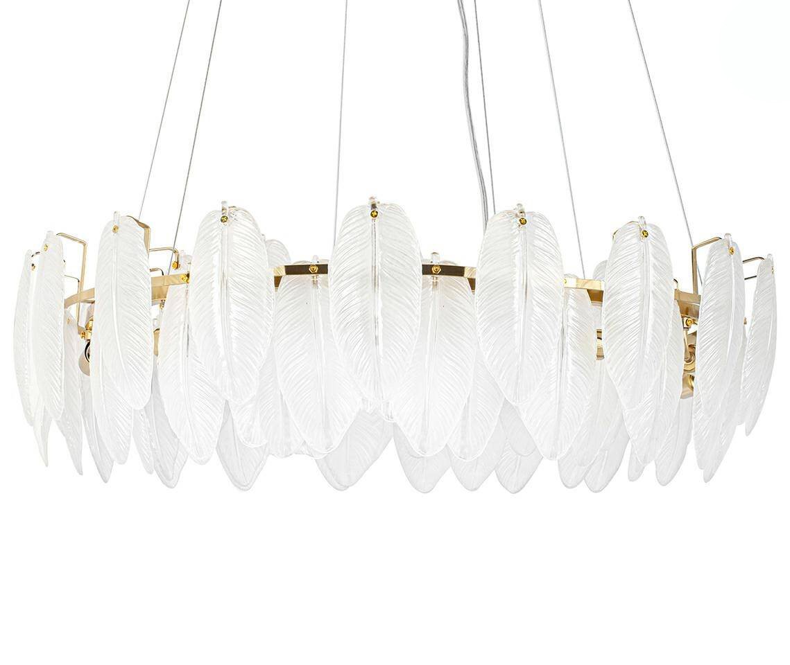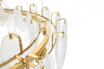 - Elegancki stelaż: Całość umieszczono na eleganckim stelażu wykończonym w złotym kolorze, który dopełnia luksusowego charakteru lampy. Złote wykończenie dodaje blasku i elegancji, podkreślając prestiżowy wygląd oświetlenia.