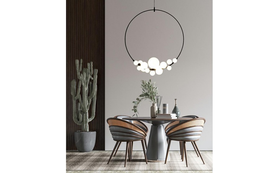 Lampa wisząca ROCIO w kolorze czarnym to niezwykła propozycja nowoczesnego oświetlenia, które nie tylko doskonale oświetli przestrzeń, ale również stanie się dekoracyjnym środkiem wyrazu w Twoim wnętrzu. Centralnym elementem lampy są białe, szklane klosze, które zostały uformowane w elegancką kompozycję skupioną na dolnej części metalowego okręgu. To nietuzinkowe ułożenie kloszy nadaje lampie charakteru i sprawia, że staje się ona zarówno funkcjonalnym źródłem światła, jak i designerskim elementem dekoracyjnym. Zastosowanie 14 punktów świetlnych gwarantuje optymalne oświetlenie, tworząc przyjemną atmosferę w pomieszczeniu.